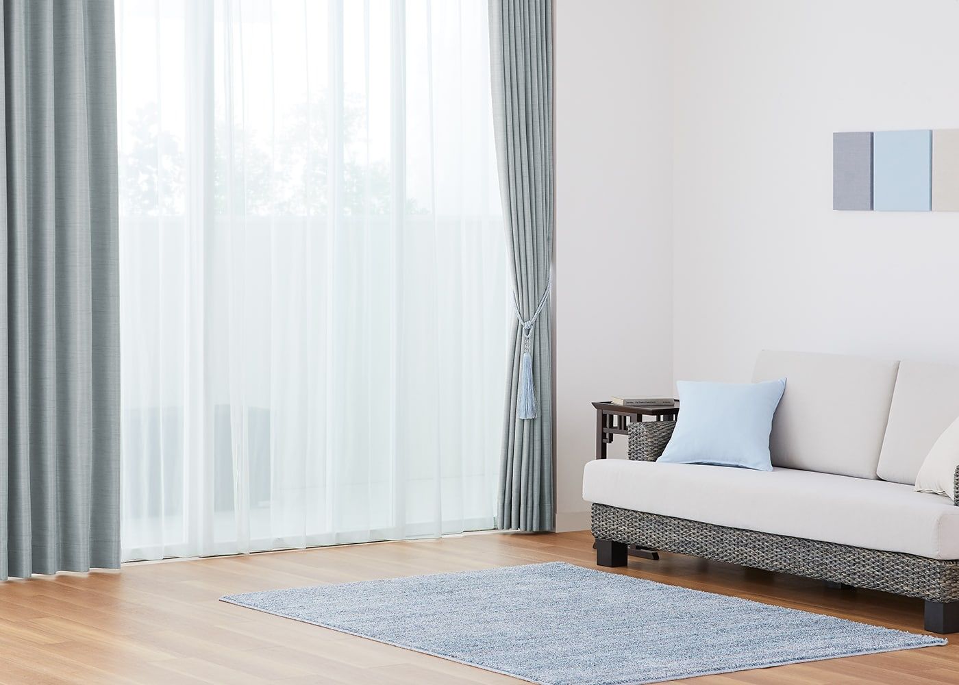 爽やかな水色のカーテンには、ライトブルーがぴったりです。カーテンの雰囲気に合わせた装飾タッセルを取り入れて、ワンランク上のインテリアを楽しんでみては。(写真はライトブルー。ドレープカーテン ジュール(ライトブルー)レースカーテン シャインv02(ライトブルー)の組み合わせ)
