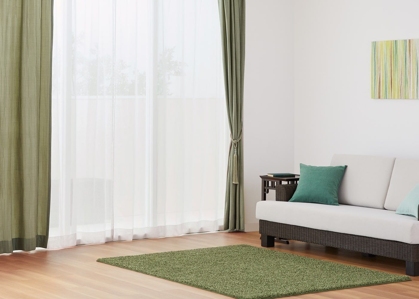 タッセルを付けるだけで、グリーンでまとめたリビングにより上質なイメージをあたえてくれます。(写真はグリーン。ドレープカーテン アルコ(グリーン)レースカーテン プルムの組み合わせ)