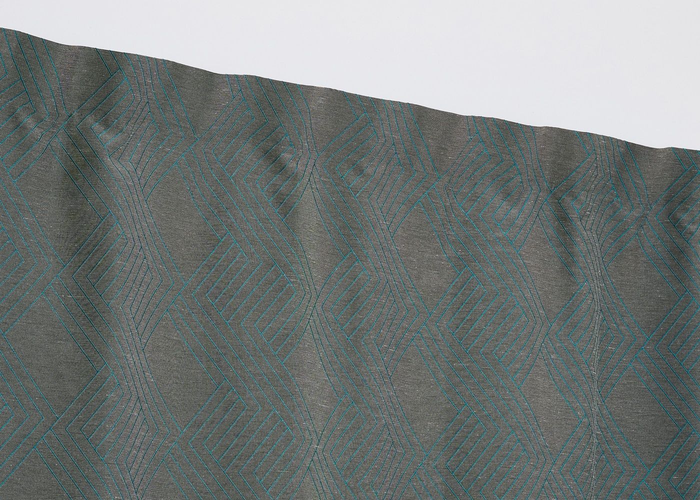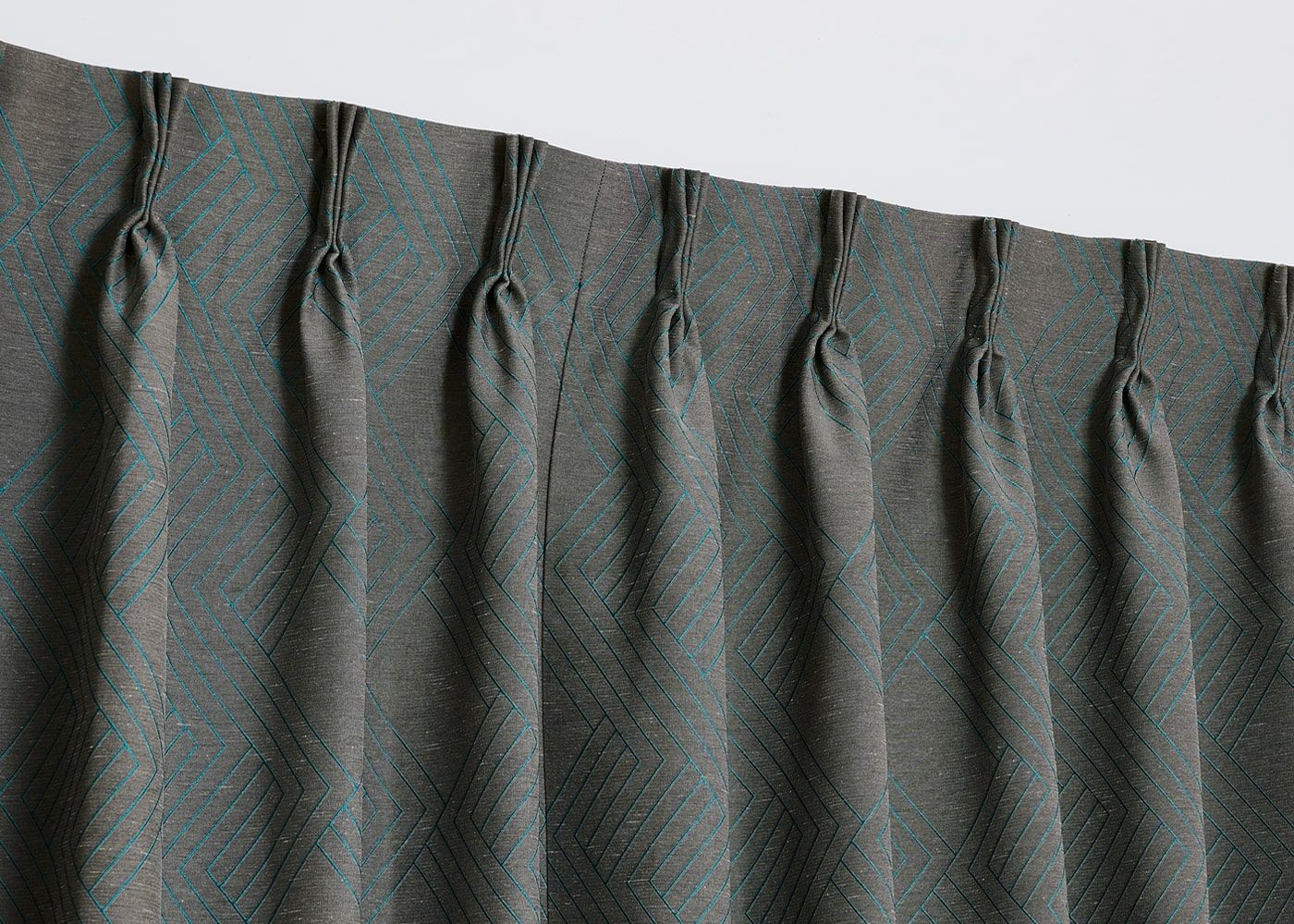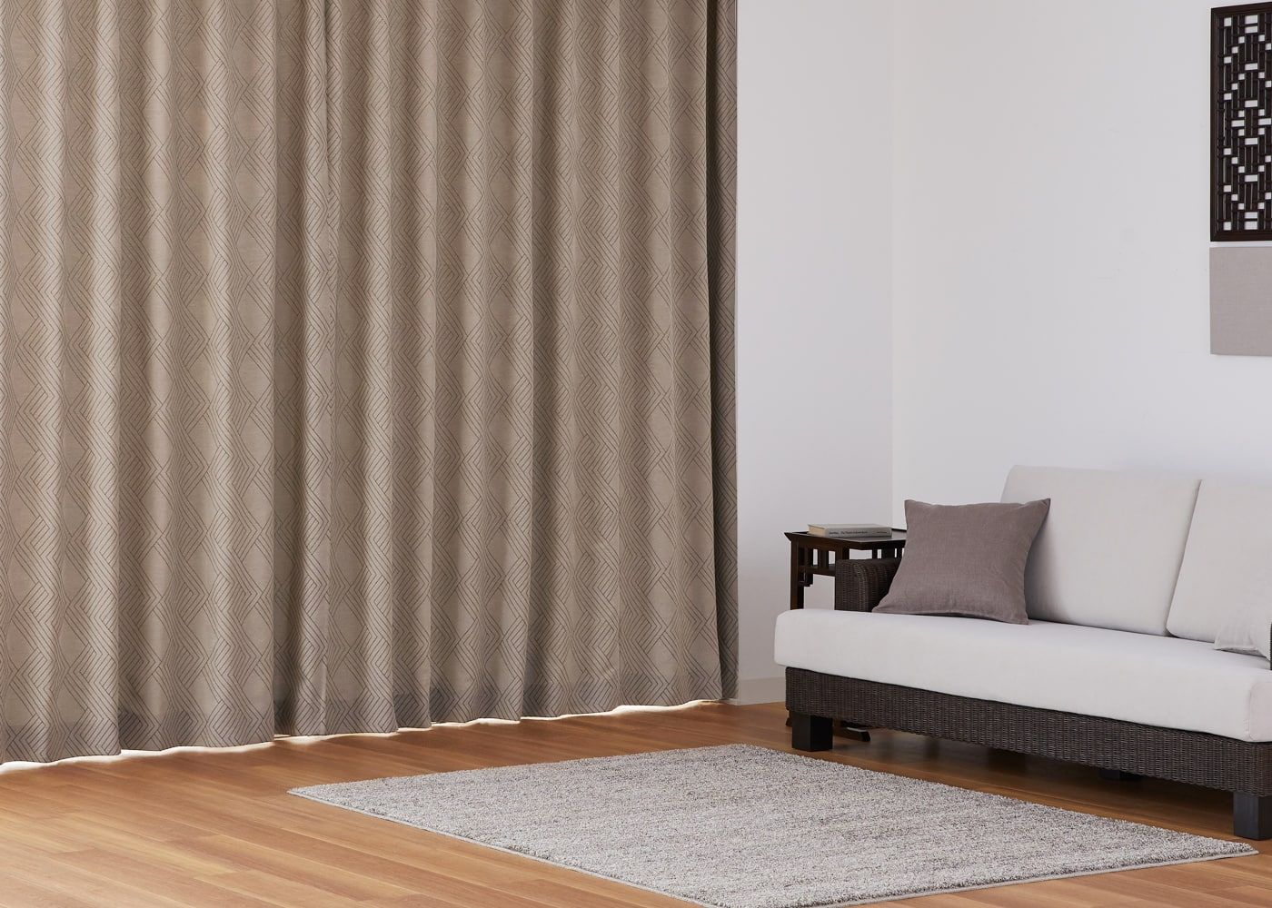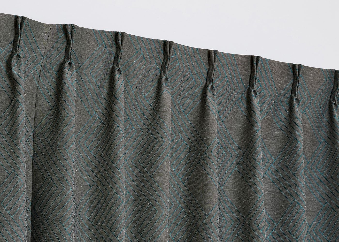繊細なラインで描いた幾何学模様が空間にさりげなくアクセントをあたえるドレープカーテン エターナル。落ち着きのあるグレーと明るい印象のサンドベージュの2色展開で、2色共に遮光率99%以上のしっかりと日差しを遮ってくれる遮光カーテンです。(写真はダークグレー ノンタック)