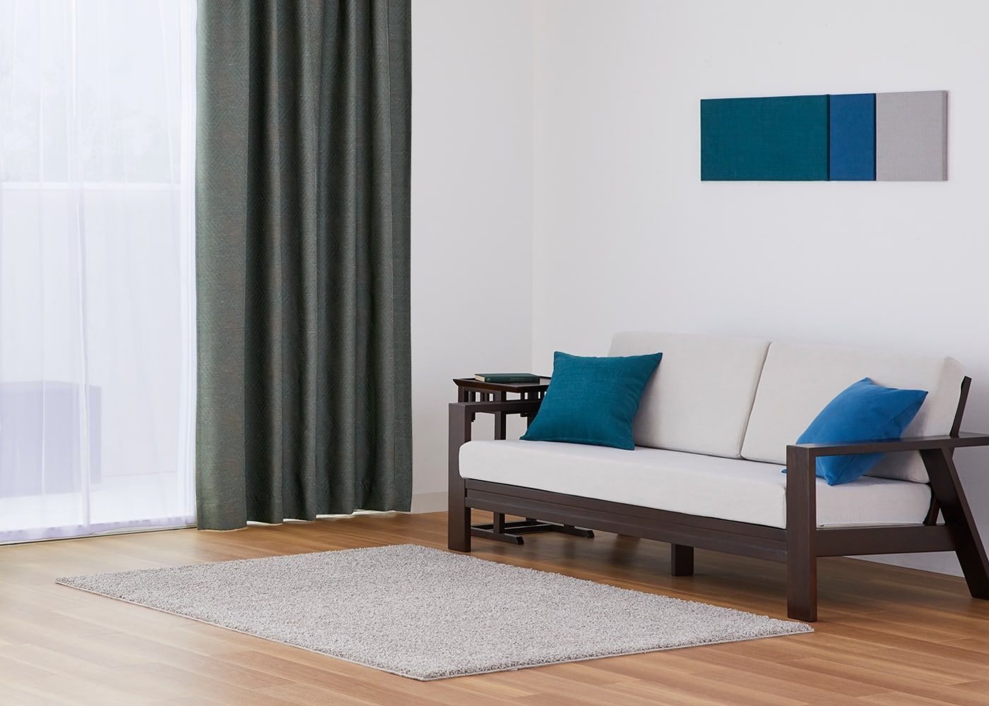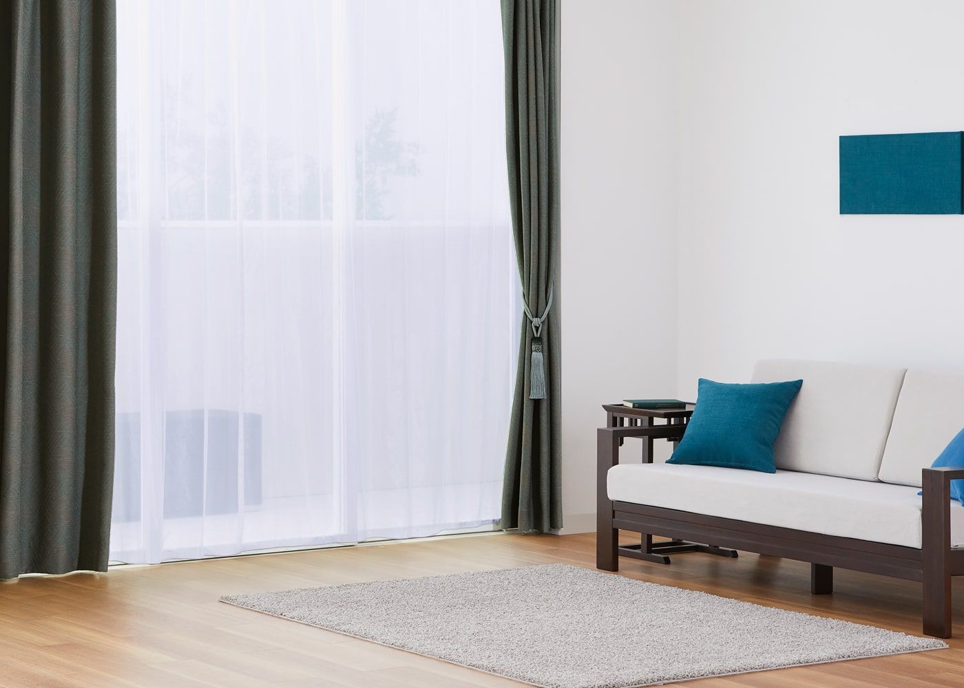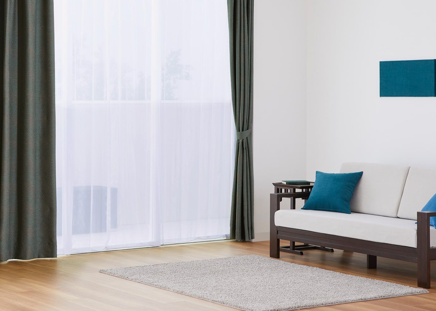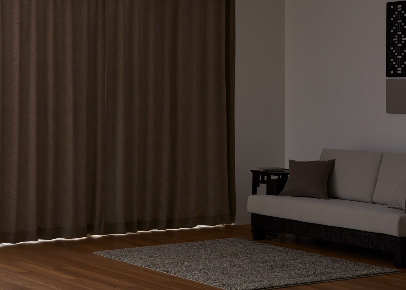 遮光2級は、人の顔や表情がわかる程度に光を調整します。寝室はもちろん、リビングで使用しても日差しをしっかり遮り、家具や床の日焼けや色あせを防ぎます。(写真はダークグレー ノンタック、室内照明OFF)