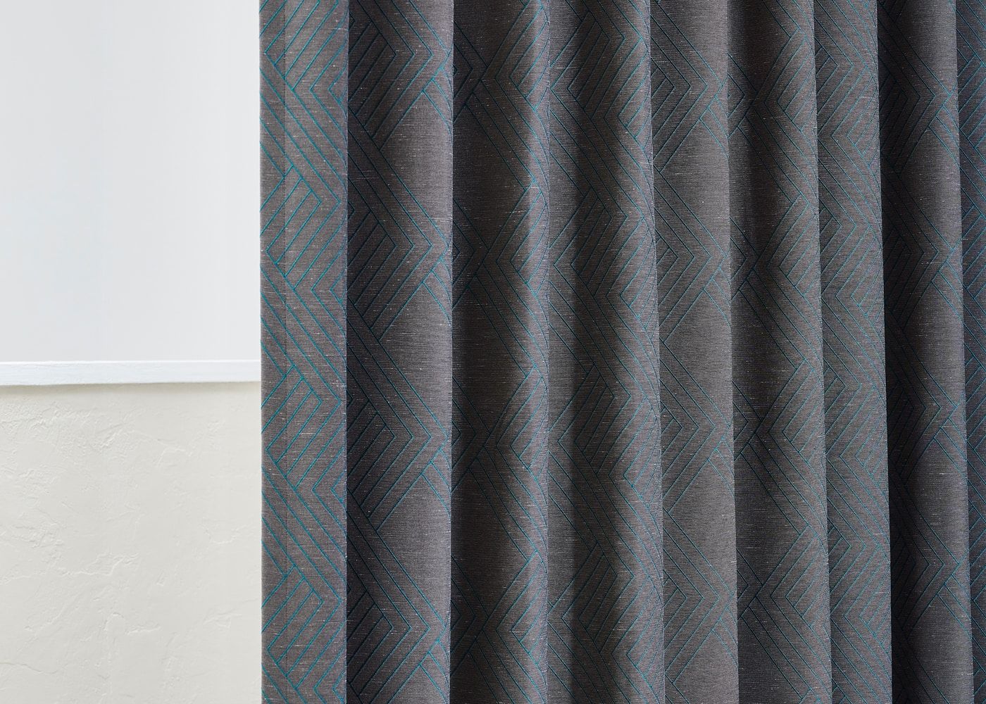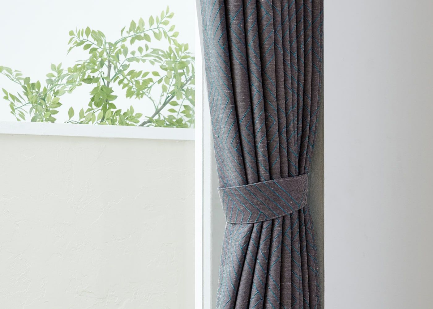 タッセルで束ねた時も、幾何学模様のラインデザインがアクセントになって、空間を彩ります。さりげない装飾で、窓辺の印象をぐっと引き締める効果も。(写真はダークグレー ノンタック)