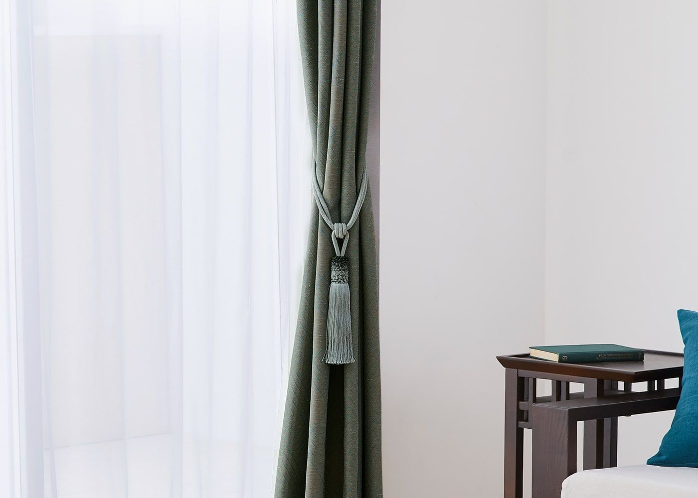 カーテンと同じ生地を使ったタッセル付きです。統一感があり、お部屋全体のコーディネートを美しくまとめます。使いやすさも考慮したデザインで、カーテンの開閉がスムーズに行えます。