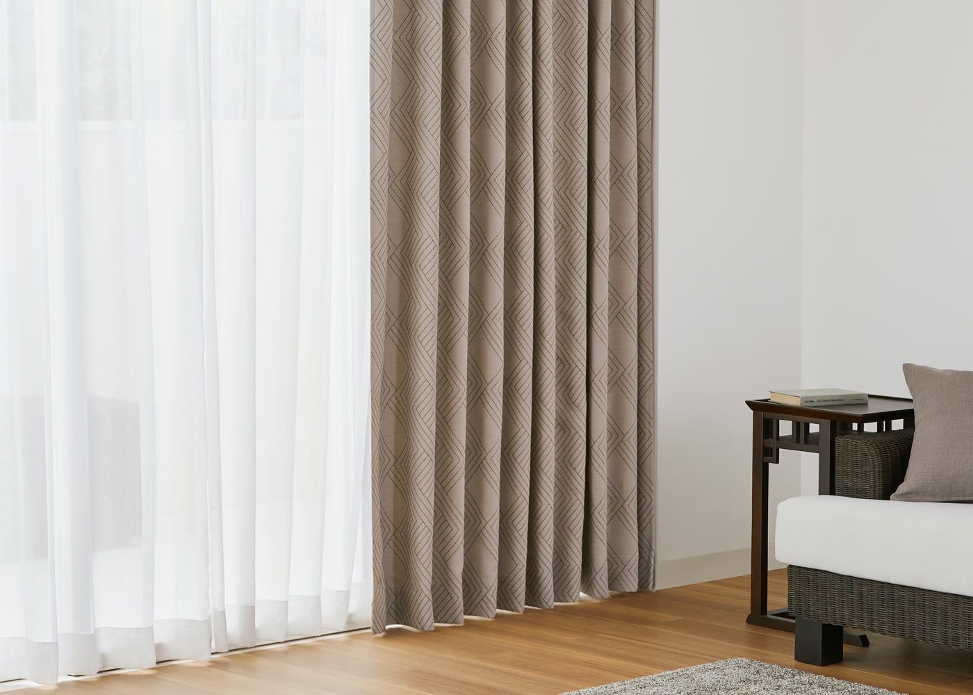 程よい柄のドレープカーテンにシンプルなレースカーテンを合わせることで、空間にちょっとしたアクセントを加えてみては。(写真はサンドベージュ プリーツ1.5倍ヒダ。