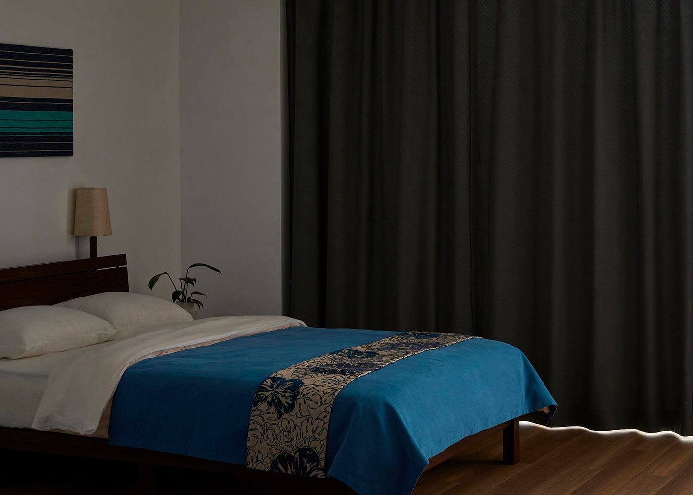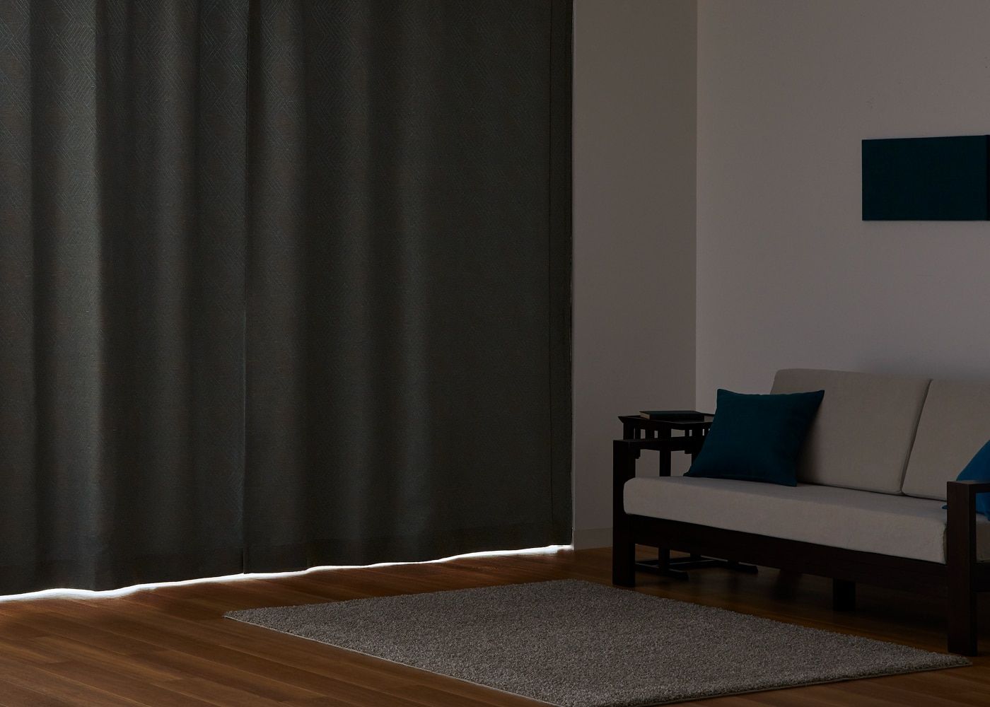 エタナールの遮光等級はカラーに関わらず、全て2級となります。窓からの光漏れを十分防ぎ、朝までぐっすり眠りたい方にもおすすめです。(写真はダークグレー ノンタック。室内照明OFF。)