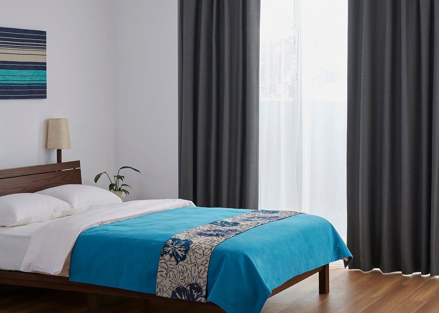 カーテンを閉じると色が際立ち、お部屋の印象を左右します。明るく爽やかにも落ち着いた雰囲気にも変わり、多彩な表情を楽しめます。(写真はダークグレー ノンタック、室内照明ON)