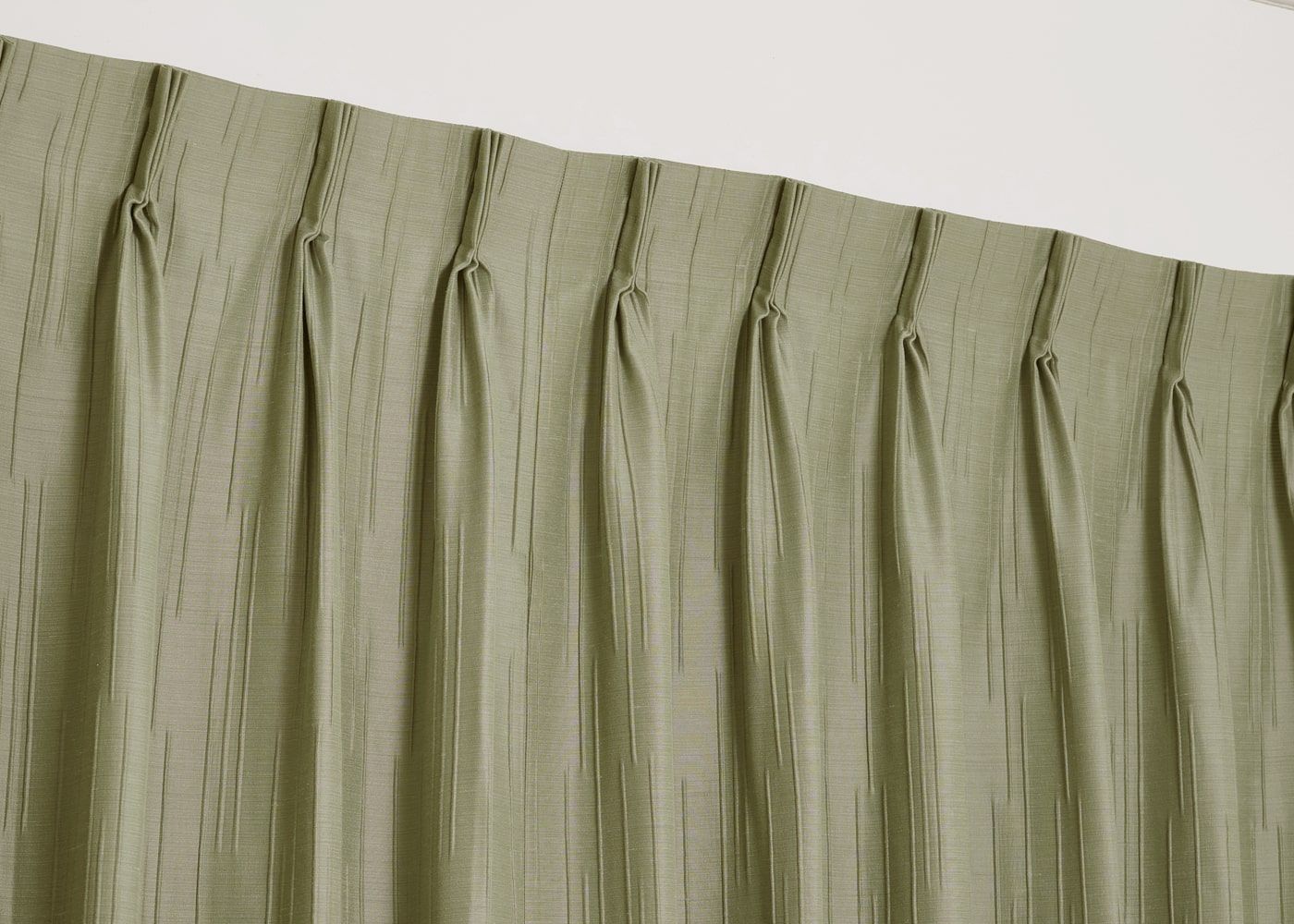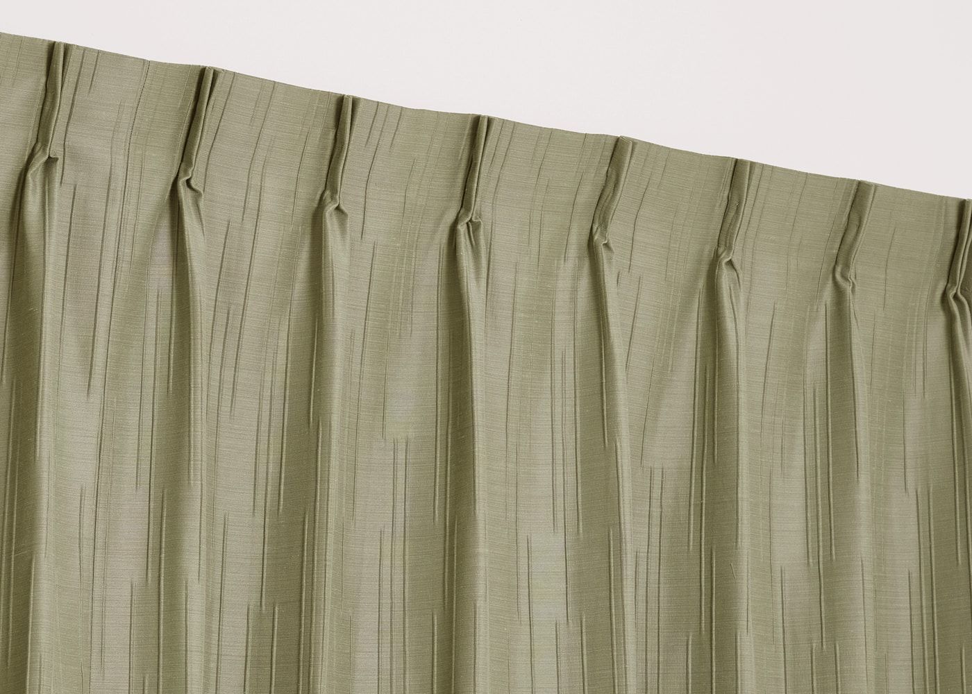 カーテンはプリーツ2倍ヒダ、1.5倍ヒダ、ノンタックの3種類。プリーツ2倍ヒダは、生地を贅沢に使いボリューム感と高級感を演出。ヒダによる空気の層で保温・断熱効果も期待できます。(写真はグリーン プリーツ2倍ヒダ)