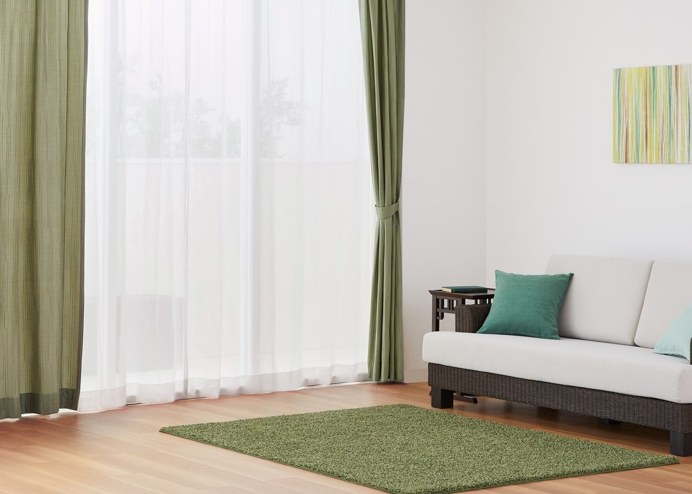穏やかな緑のドレープカーテンに真っ白なレースカーテンを組み合わせると、より明るい雰囲気を演出してくれます。(写真はグリーン ノンタック。
