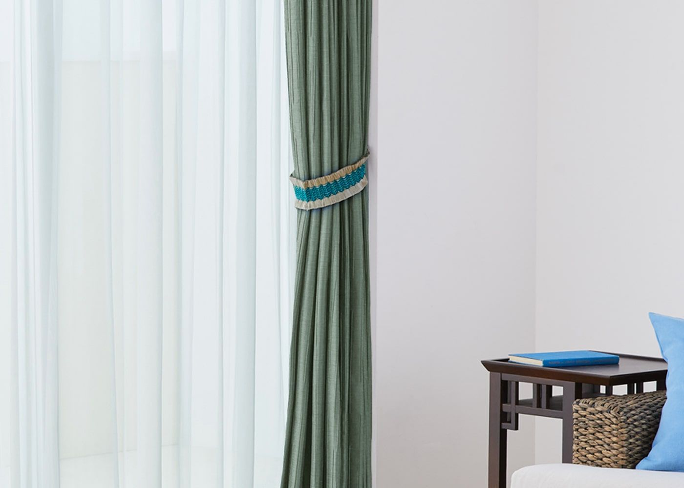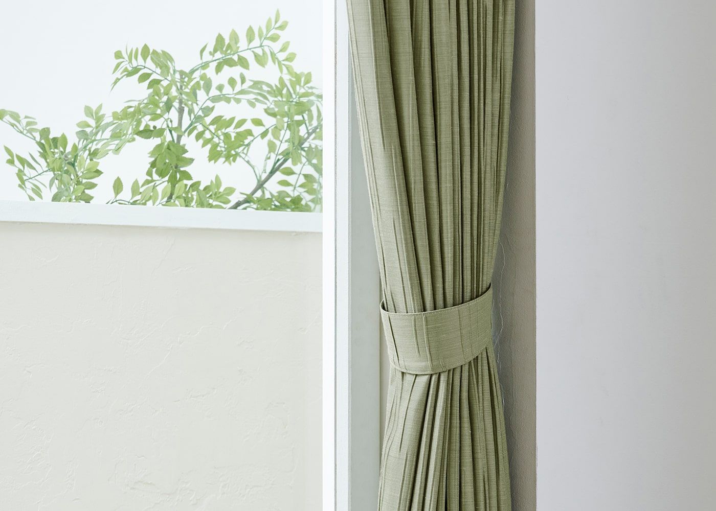 タッセルで束ねたイメージです。美しくまとまったカーテンは空間に上品なアクセントを添えます。さりげない装飾で、窓辺の印象をぐっと引き締める効果も。(写真はグリーン ノンタック)