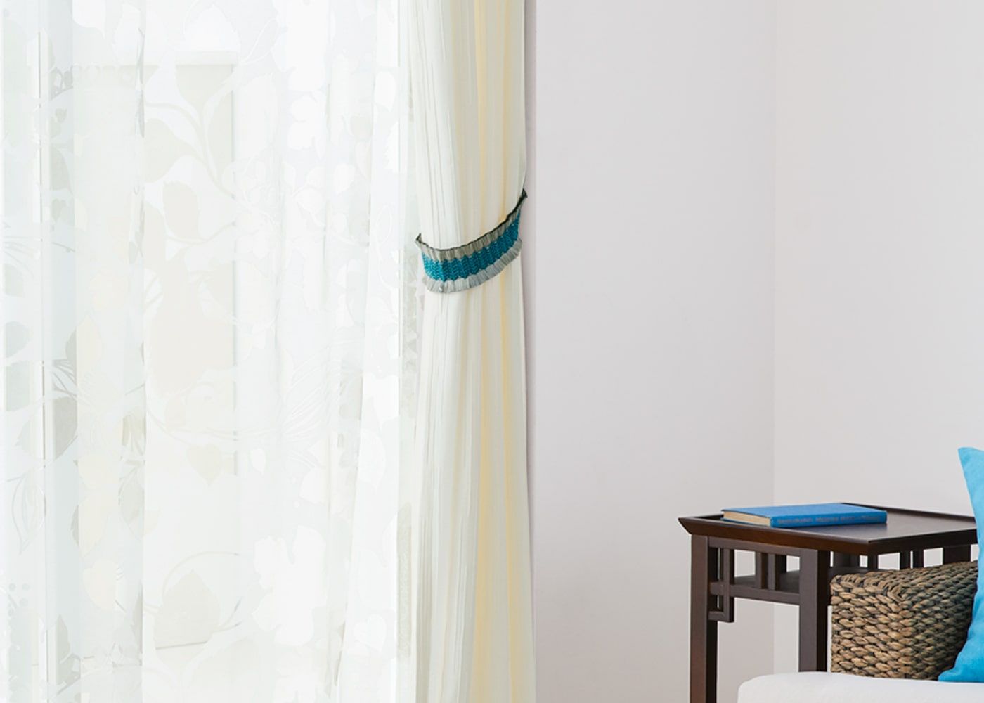 ボタニカル柄のレースカーテンとシンプルなドレープカーテンが調和した空間で、ゆったりとした時間を寛いでみては。(写真はホワイト ノンタック。