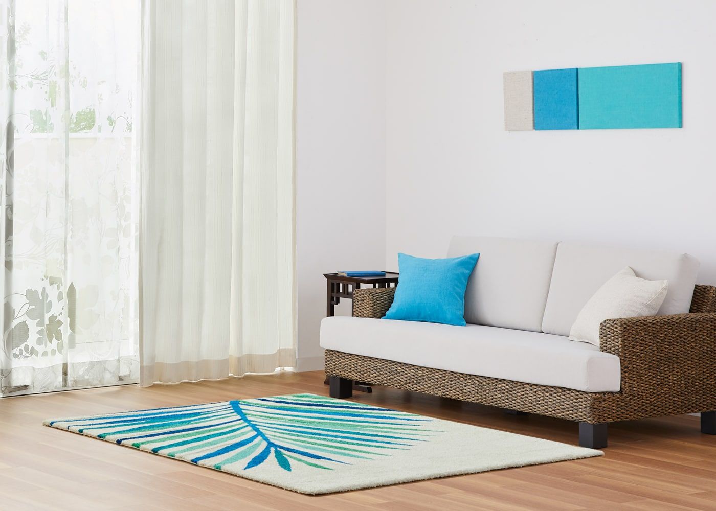 ラグを添えるだけで、白浜のビーチを彷彿とさせるトロピカルなコーディネートの完成です。(写真はホワイト ノンタック)