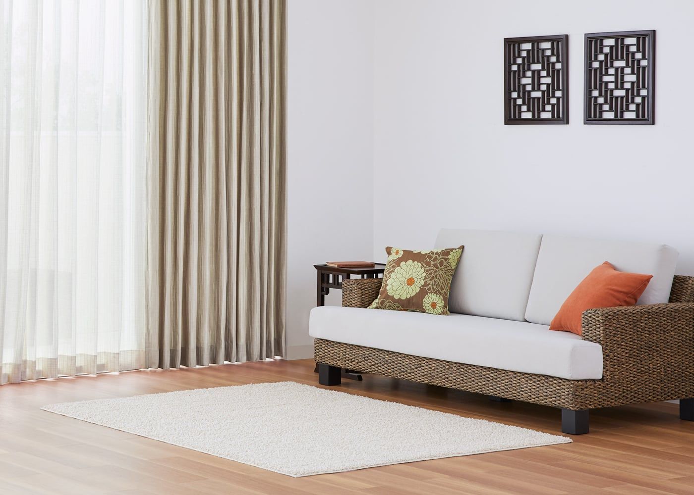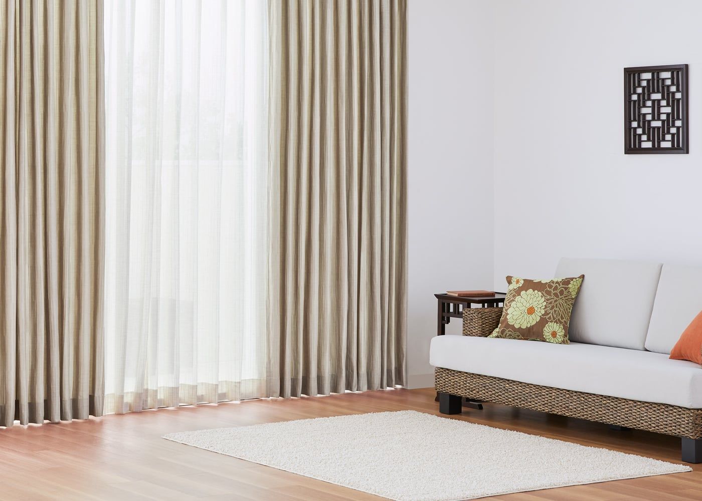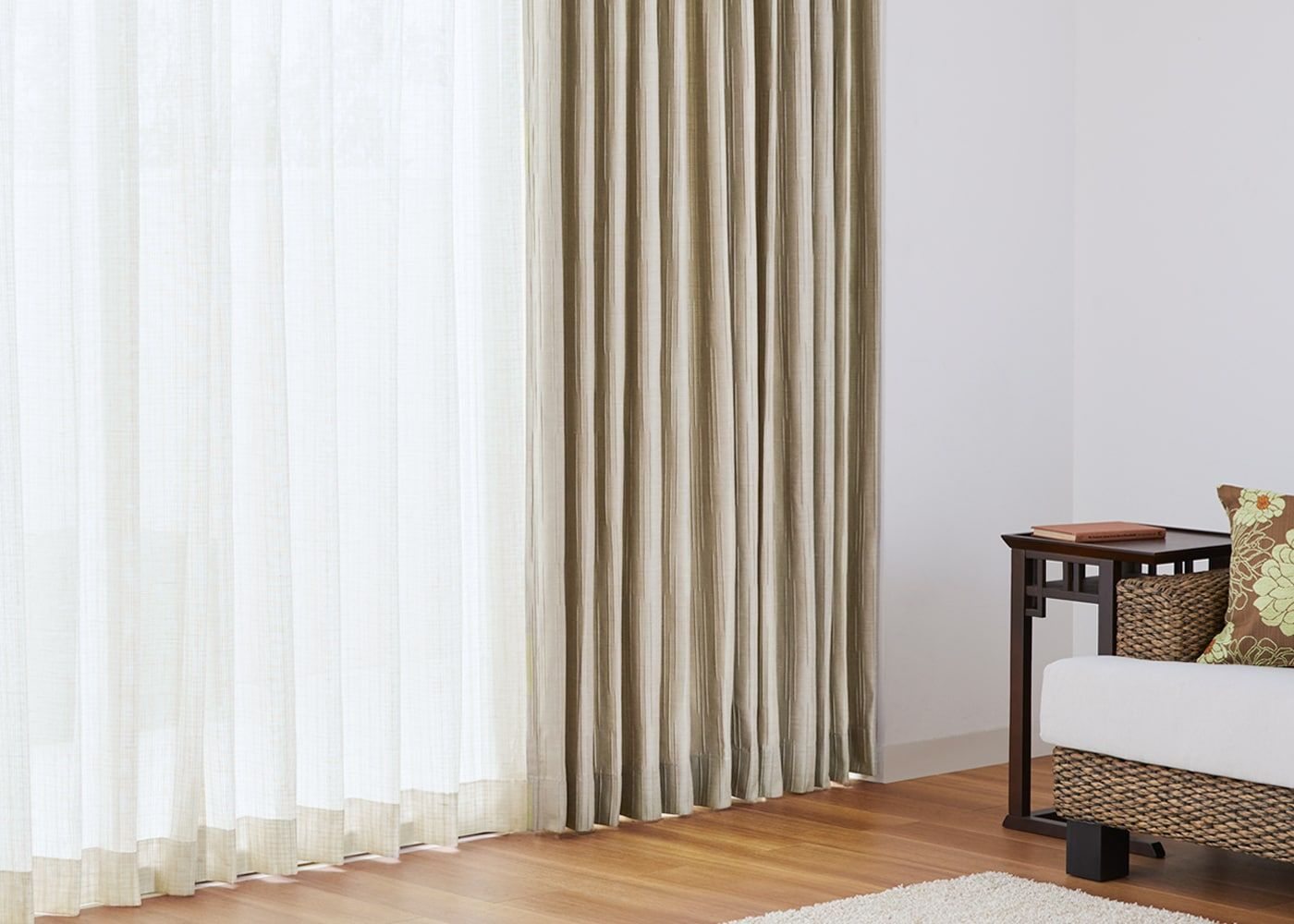 ベージュのドレープカーテンに素材感のあるレースカーテンを合わせると、より一層温かみのあるお部屋になります。(写真はベージュ プリーツ2倍ヒダ。