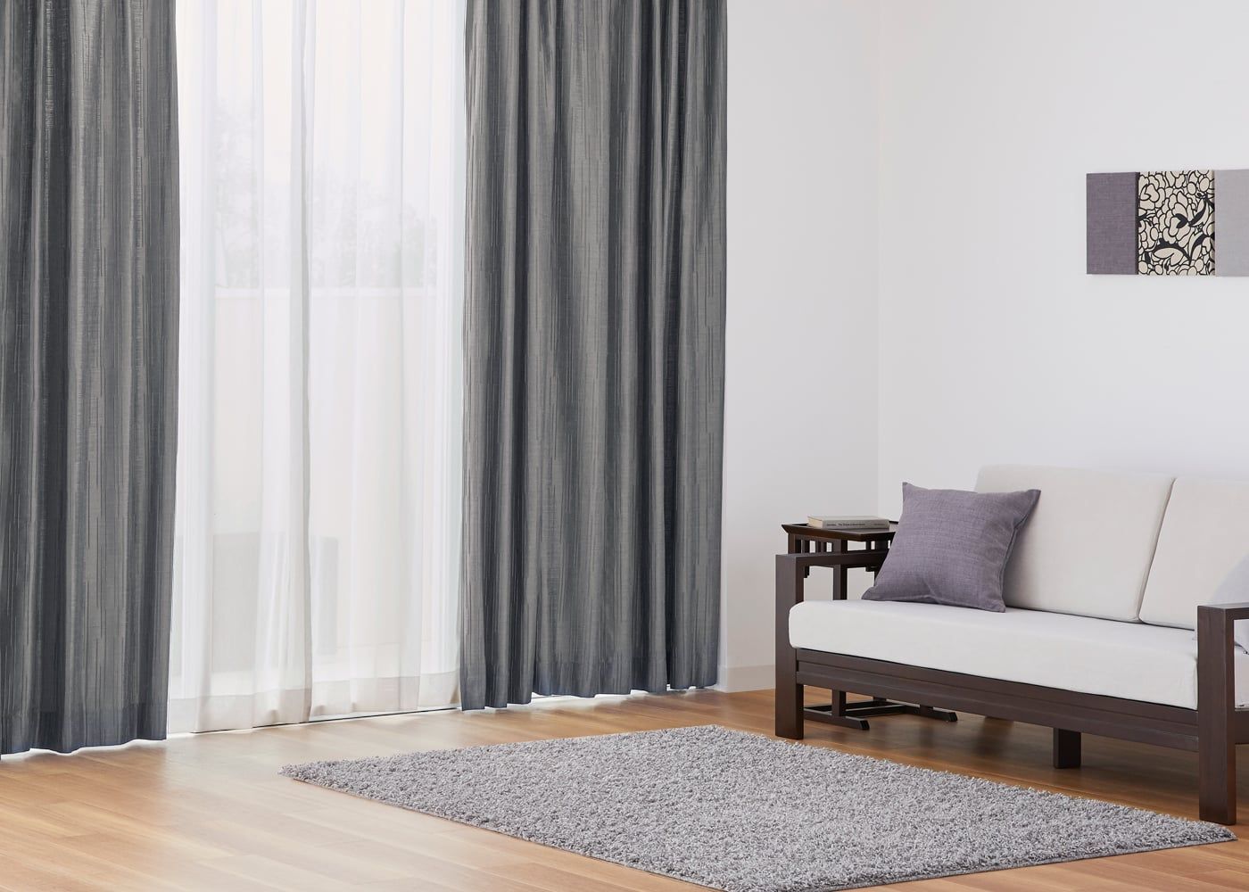 シンプルなレースカーテンと組み合わせると、ドレープカーテンの艶感や陰影がより際立ちます。(写真はグレー プリーツ1.5倍ヒダ。