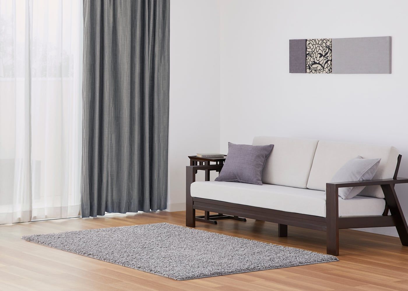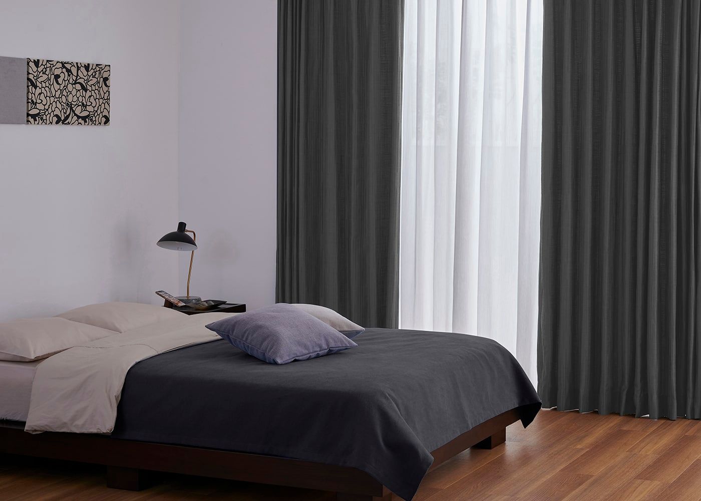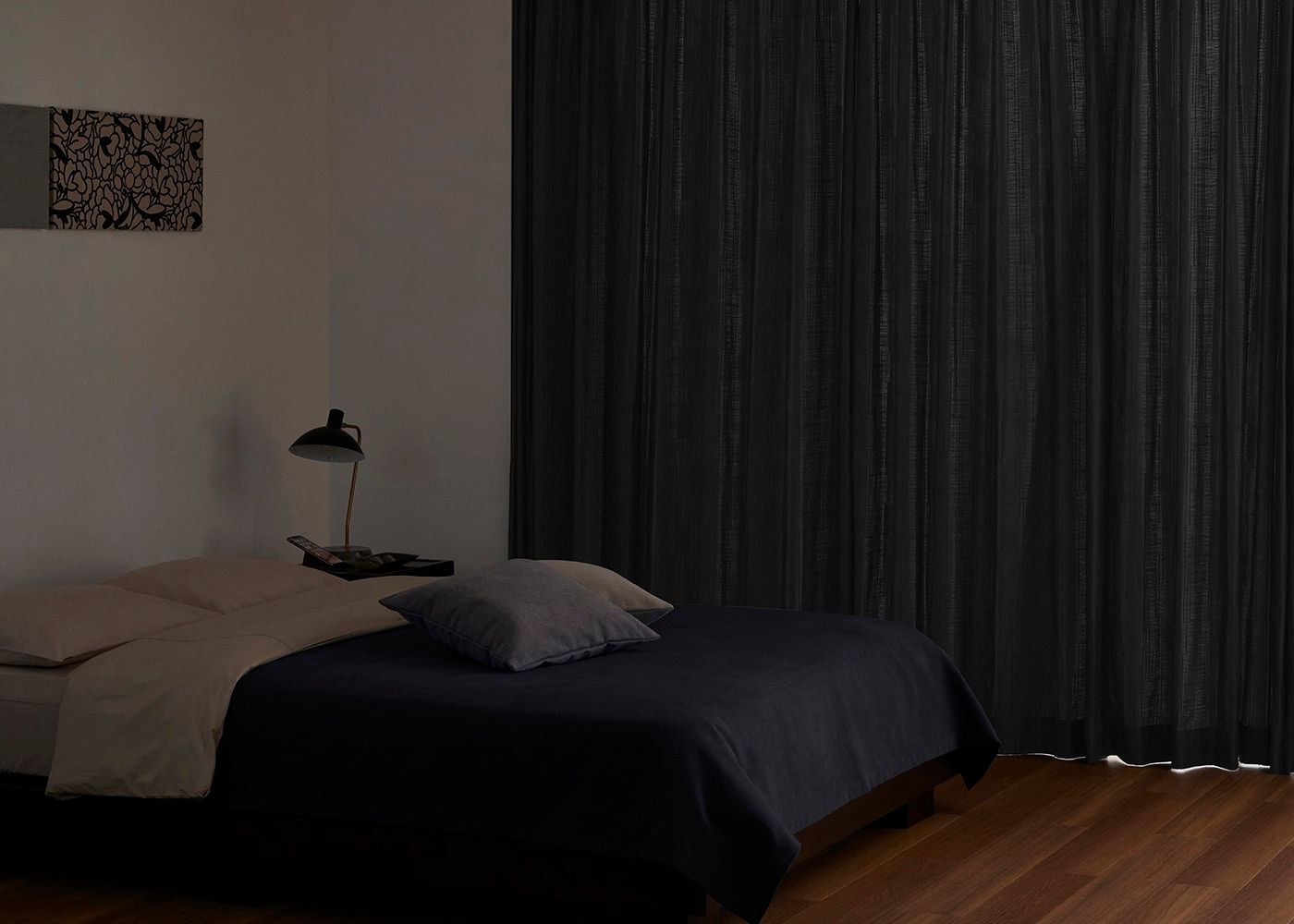 アルコは生地が厚いため、遮熱タイプのレースカーテンと合わせることで、遮光カーテンのように室内への光を遮ってくれます。(写真はグレー プリーツ1.5倍ヒダ。