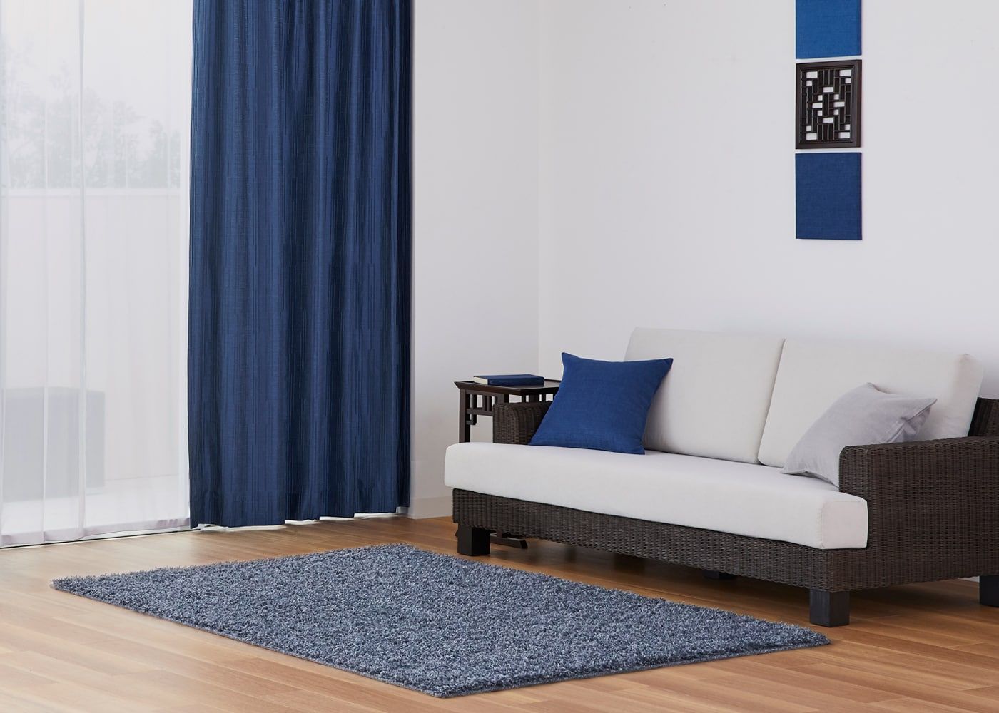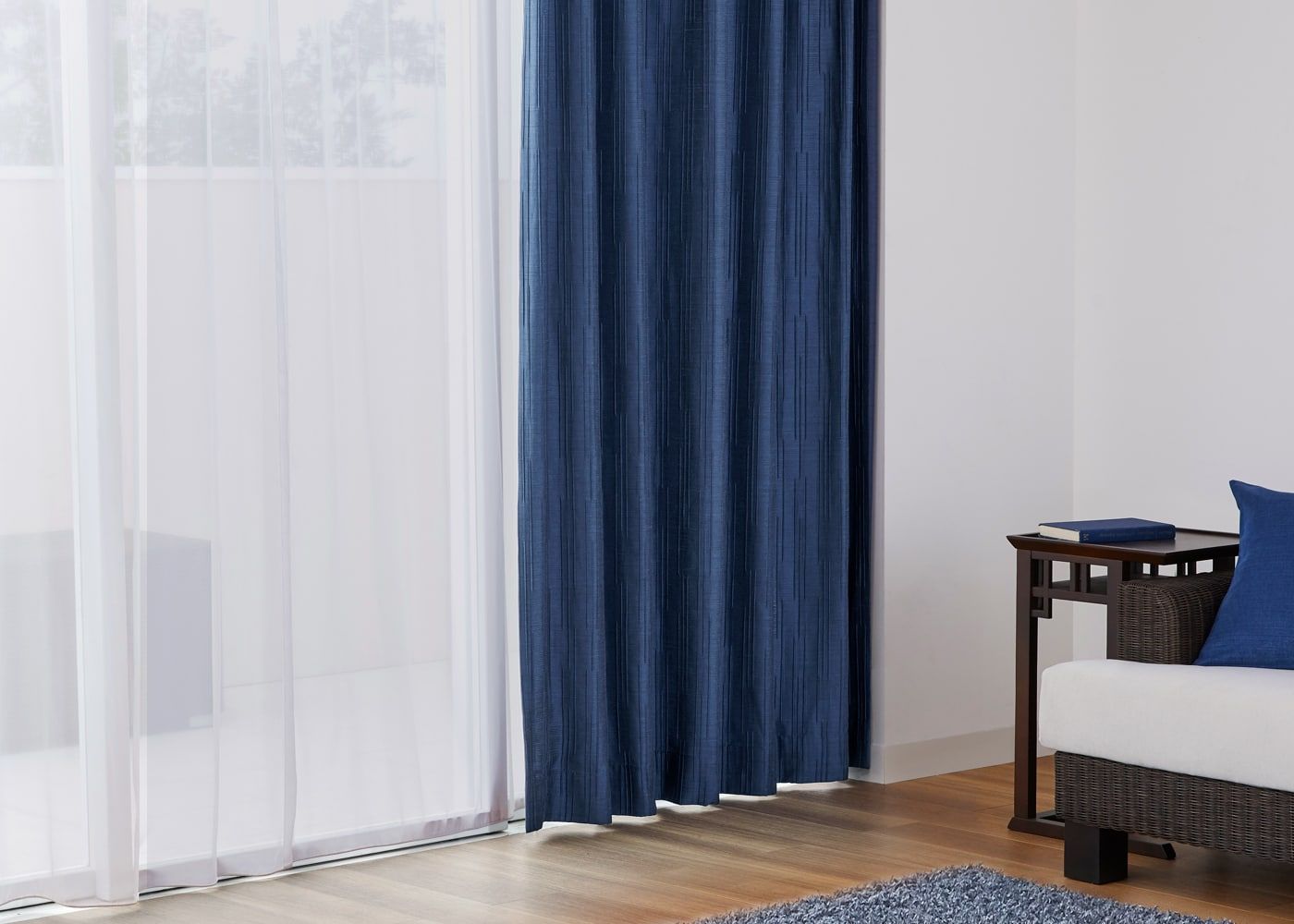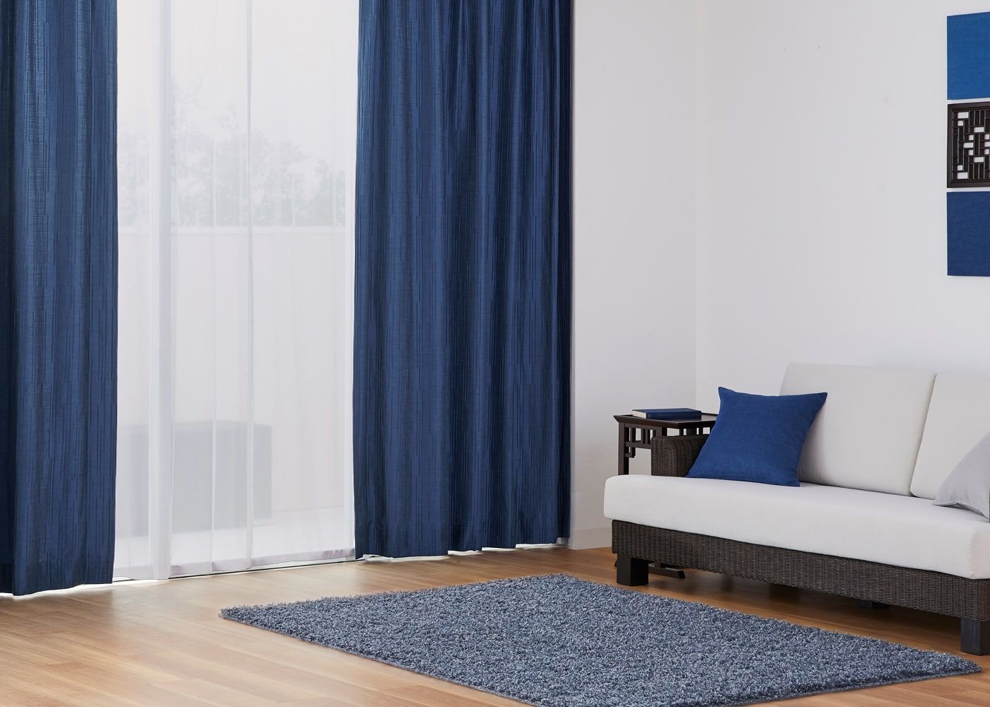 心落ち着く静寂な空間にしたい方には、ブルー系のカーテンがおすすめ。ノンタックで凹凸のある生地感と陰影がより際立ちます。(写真はネイビー ノンタック)