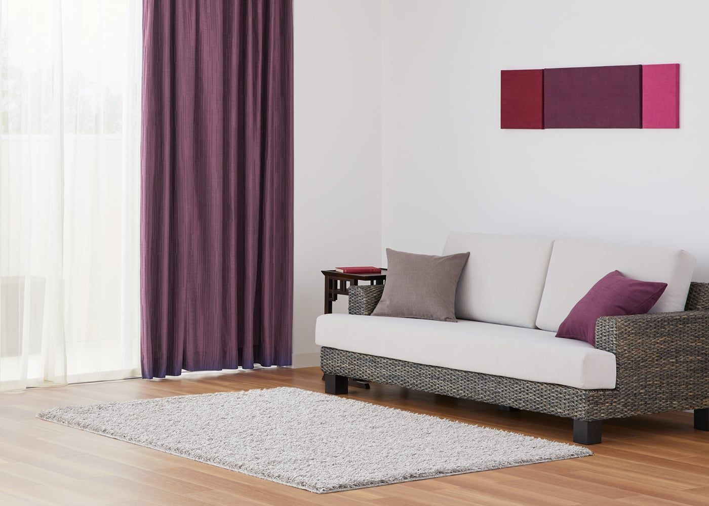 ヒヤシンスソファを中心に、赤紫のカーテンに合わせた