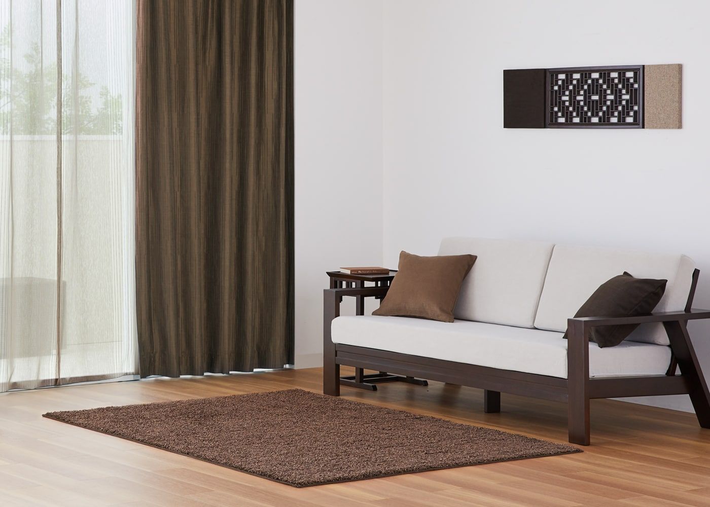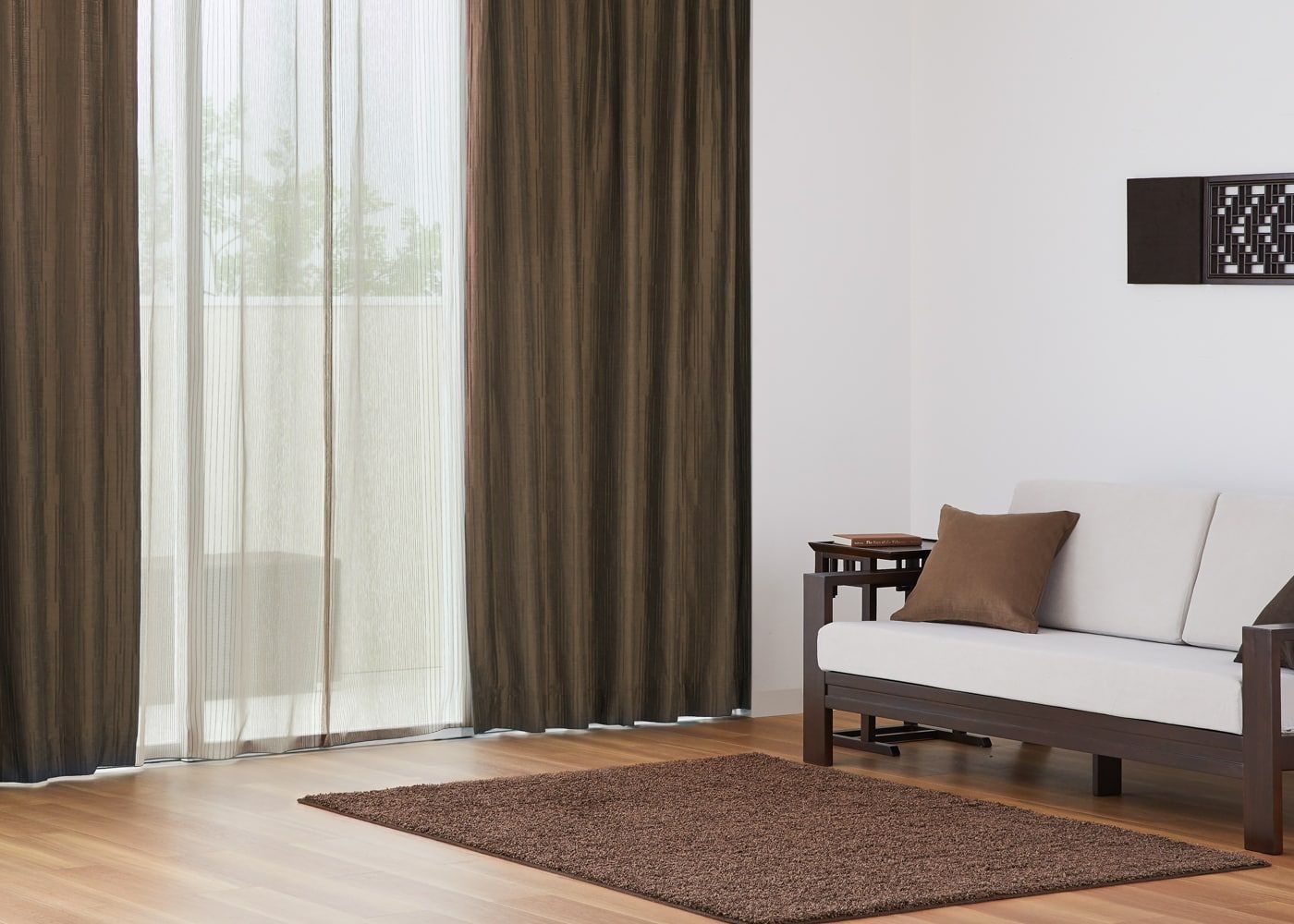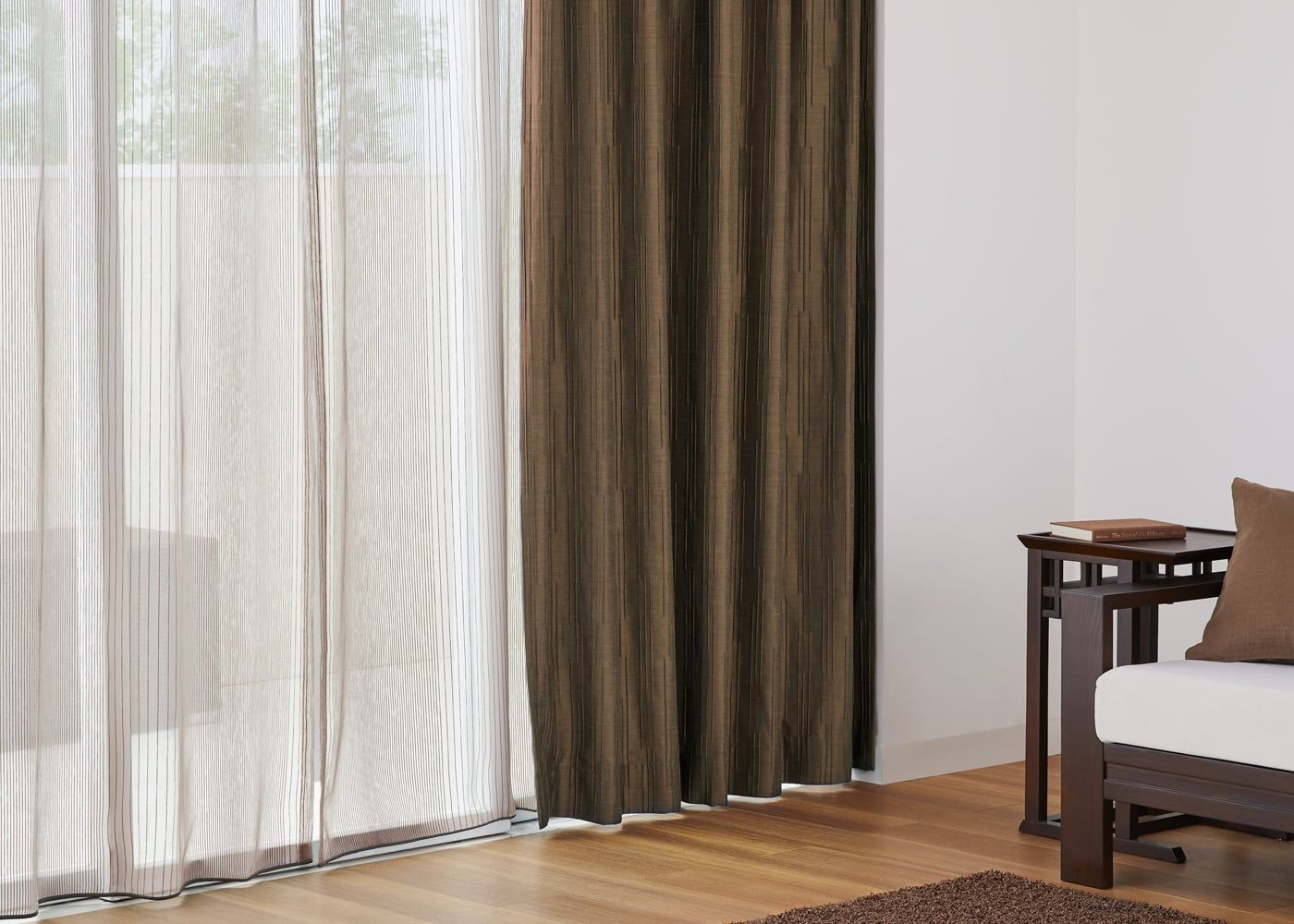 アルコの縦ラインと茶色にリンクしたレースカーテンを組み合わせて、大人な雰囲気を演出してみては。(写真はブラウン ノンタック。