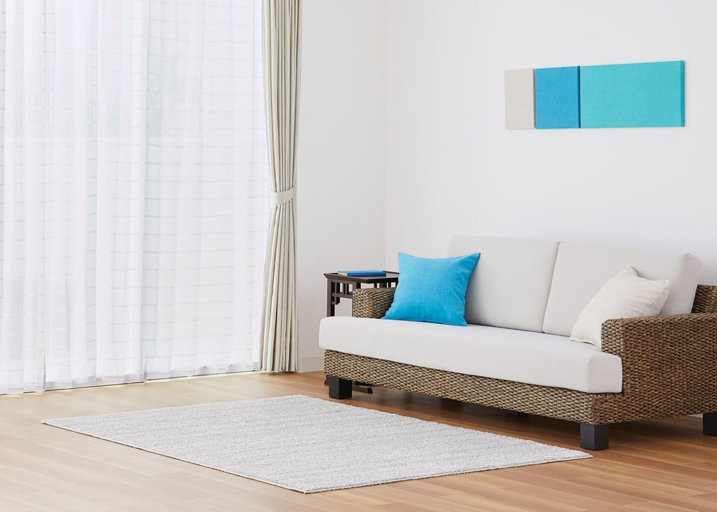 ラグを添えるだけで、白浜のビーチを思わせるターコイズブルーコーディネートの完成です。(写真はホワイト プリーツ1.5倍ヒダ)