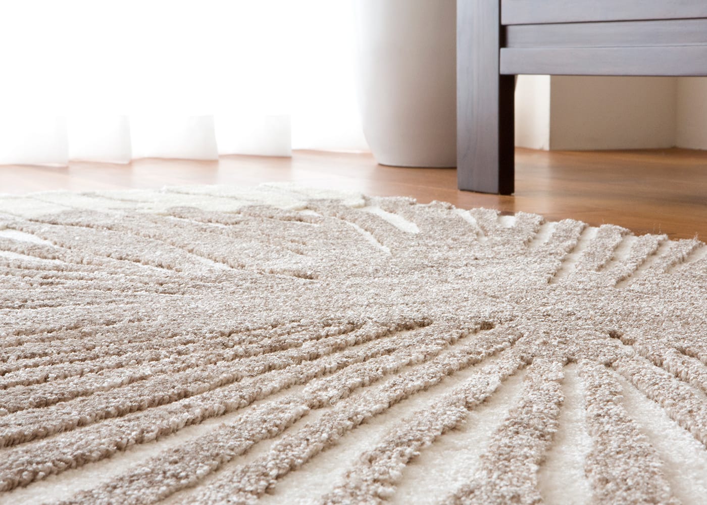 長さ15mmと10mmの2種類のパイルを使い分けることで、立体的に浮かび上がる菊の花。ベージュとアイボリーのツートンカラーで花柄がより際立ちます。ナイロンパイルは水に濡れても乾きが早く、カビにも強いのが特長。長繊維を使用した遊び毛が出にくいラグです。「防炎」や床暖房やホットカーペットにも使える「耐熱加工」も施しています。
