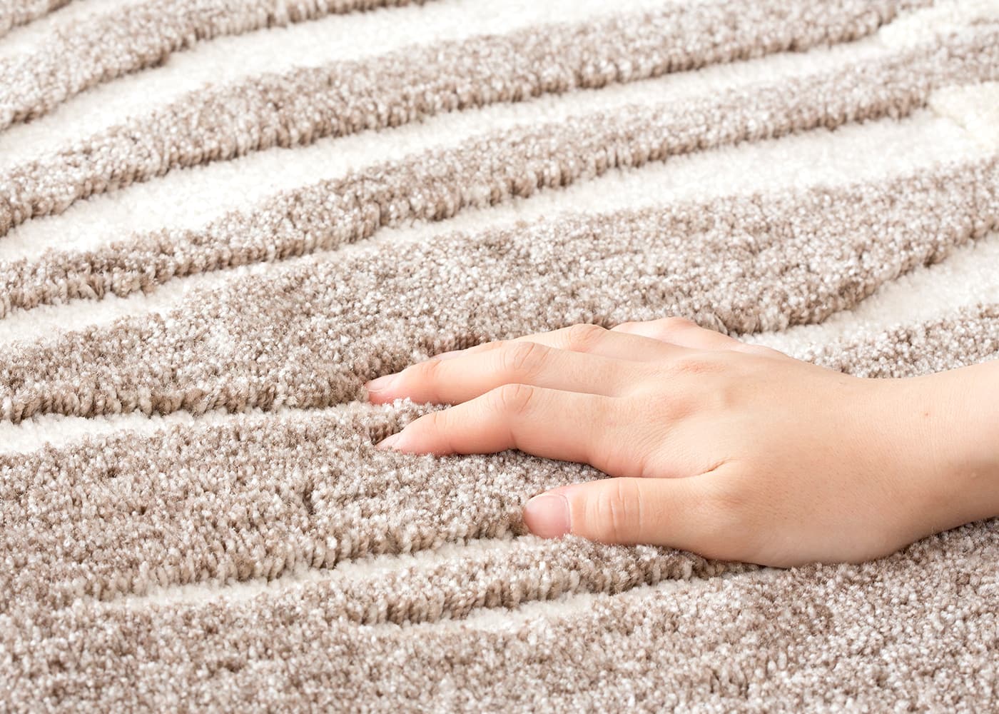 ナイロン100%のさらっとした、程よい弾力とふっくらとしたボリュームのある心地良い肌ざわりです。素足で歩いた時に感じる、フック製法ならではの肉厚で柔らかな触り心地をお楽しみください。耐久性のあるナイロンはテーブルの脚の跡もつきにくく、風合いが長持ちします。