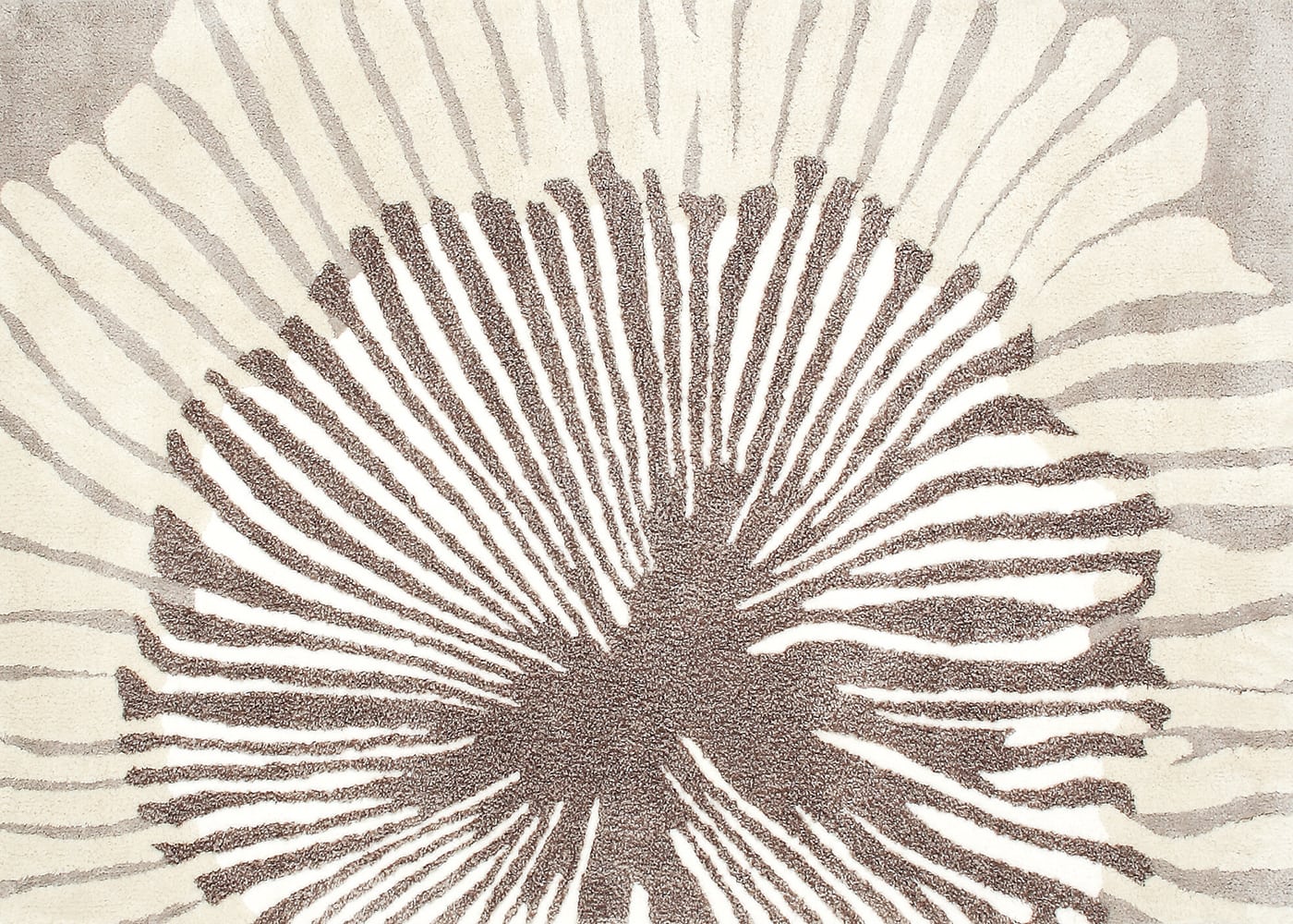細やかな花びらが美しい、菊の花をモチーフにしたラグ フルール。大胆な柄でもベージュやグレーといった落ち着いた色合いが魅力の