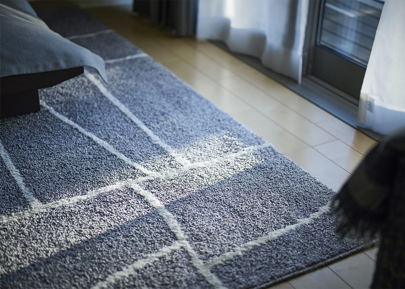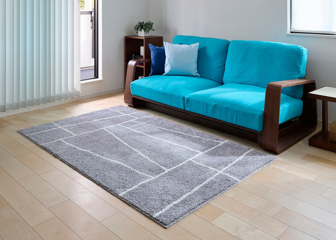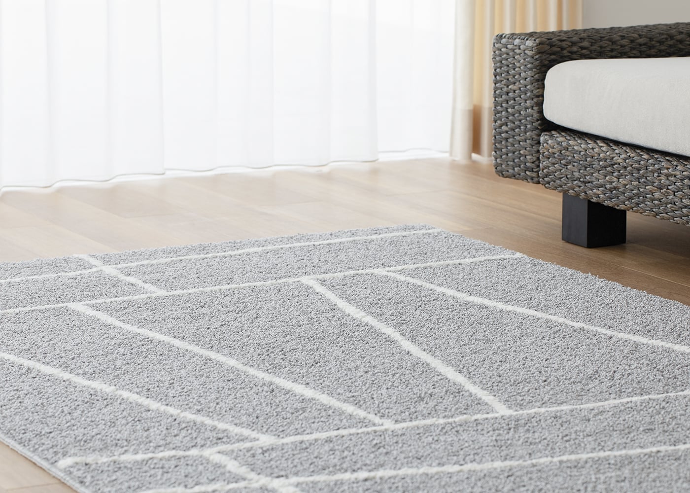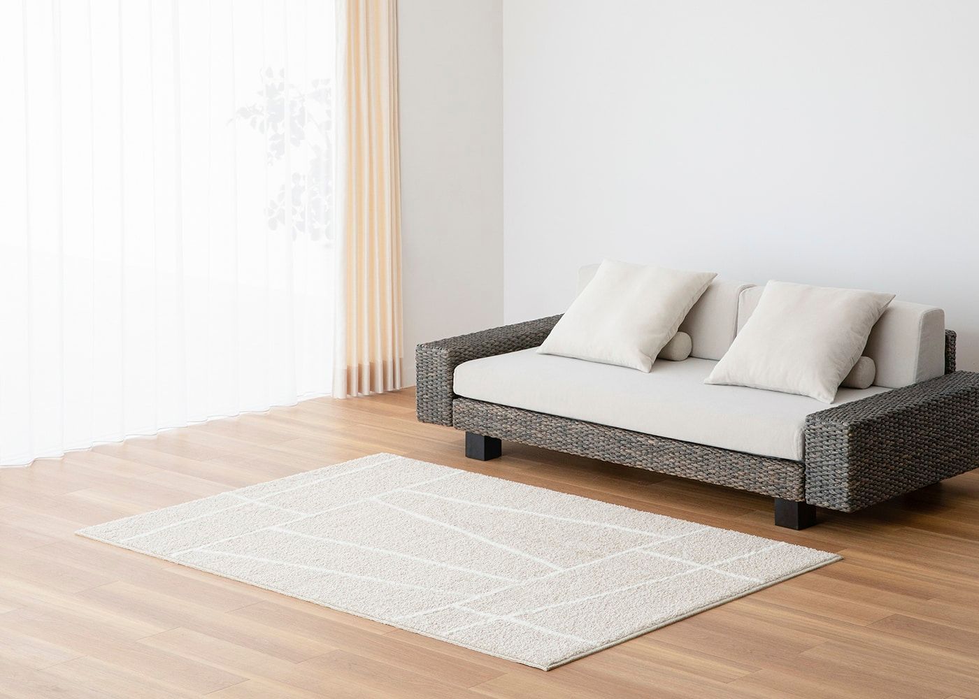 ナイロン100%のさらっとした手触りが魅力のラグ。糸の撚り方で触り心地とデザインを際立たせ、耐久性が高く床暖房対応。水やカビに強く遊び毛も出にくい、長く使える一枚です。
