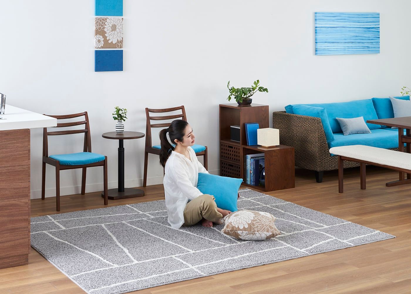 鮮やかなターコイズブルーで彩られた、アイランドブルー・スタイルのリビング空間。海や砂浜の雰囲気を、澄んだブルーのクッションカバーやグレーのラグで表現しました。(写真はライトグレー1900×2400mm)