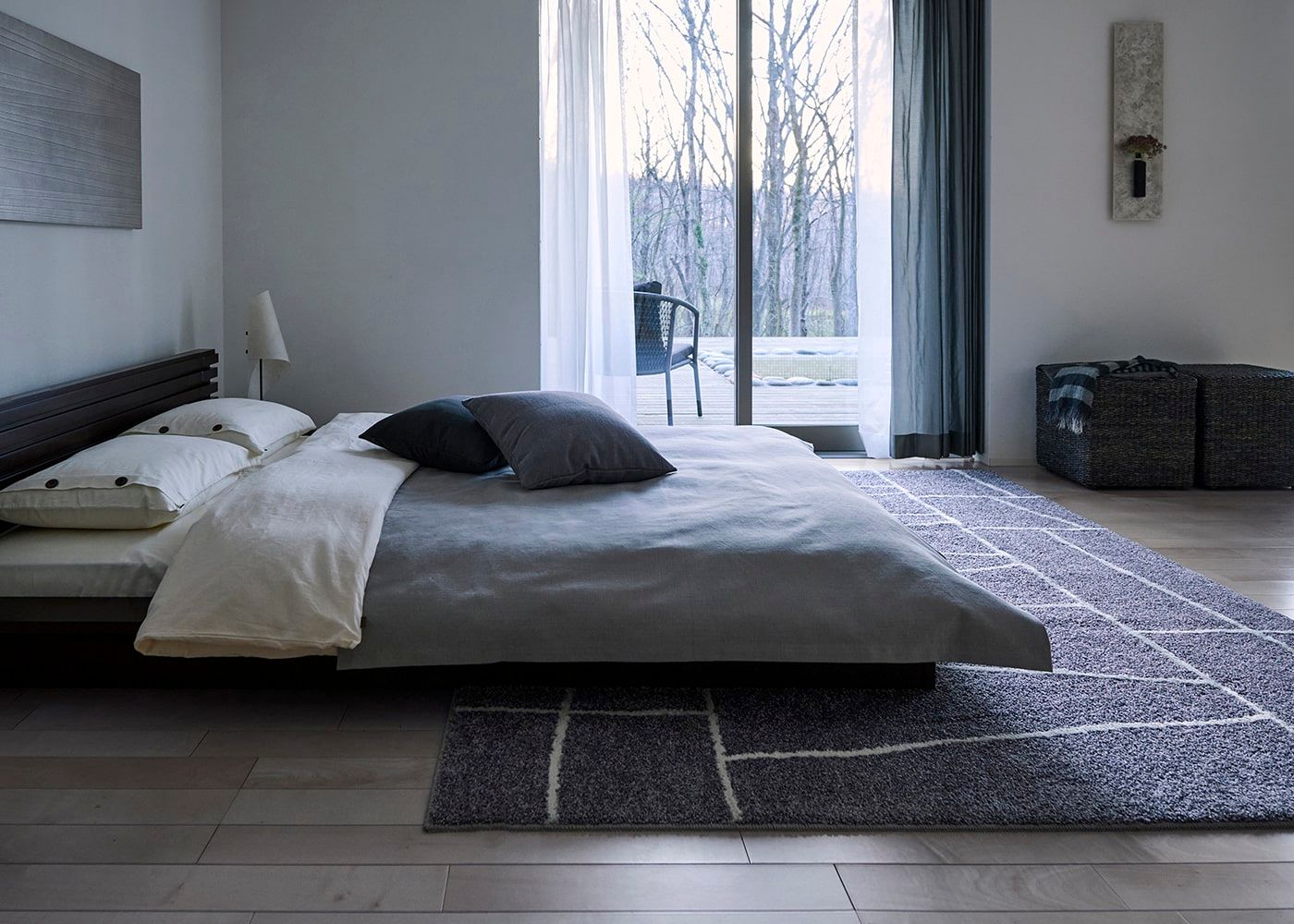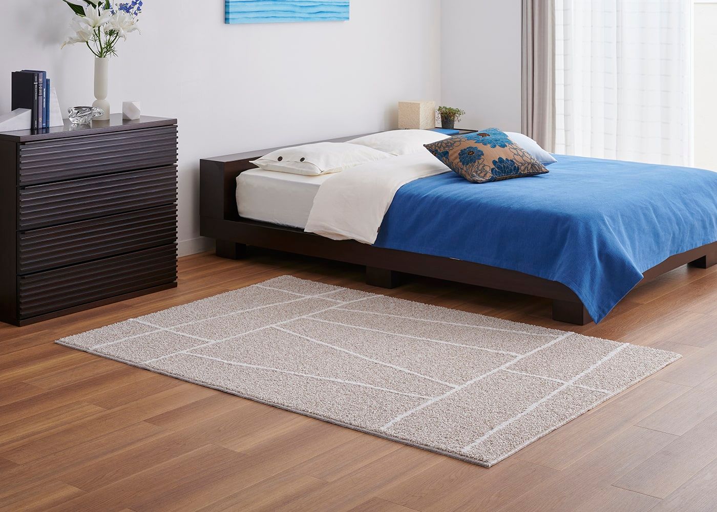 ラグ コルダをベッド横に敷いたコーディネート例。爽やかなブルーで彩った空間に、砂浜を感じさせるような合わせ方です。寝室にラグを敷くことで床周りにアクセントをプラスできたり、埃の吸着・声の吸音などの機能性を持たせることもできます。(写真はベージュ、1300×1900mm)