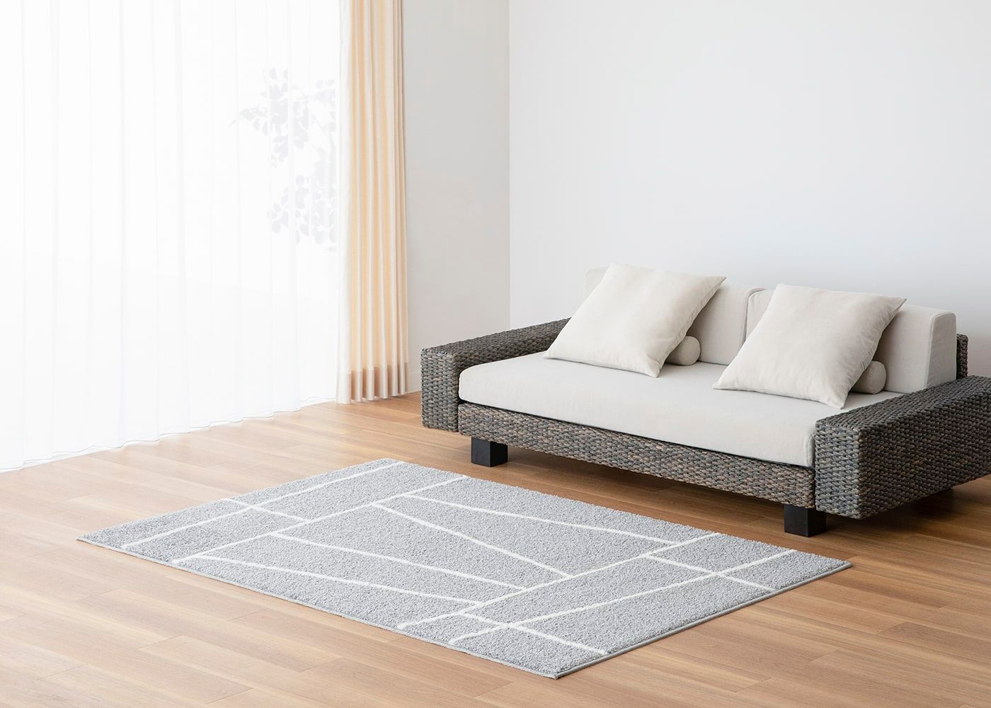 手描きのようなやさしいラインが穏やかな気持ちにさせるラグ コルダ。ランダムな太さの線がどこか抜けを感じ、リラックス空間にぴったりの柔らかいデザインが魅力です。(写真はライトグレー 1300×1900mm)