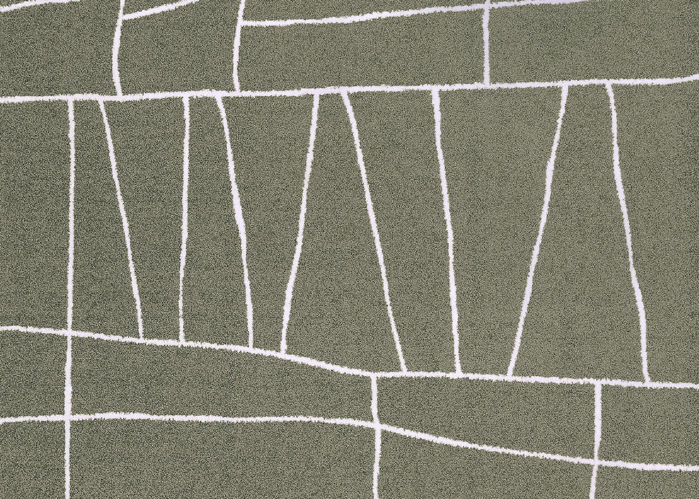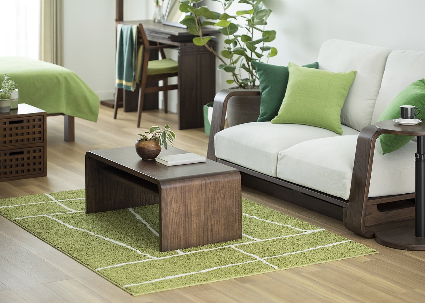 温もりを与えるグリーンカラーが魅力的な、ヴィラ風のリゾート空間に調和するモス。ランダムに描かれた幾何学模様が、ハイバックソファの足元のスペースにリラックス空間を生み出します。(写真はモス1300×1900mm)