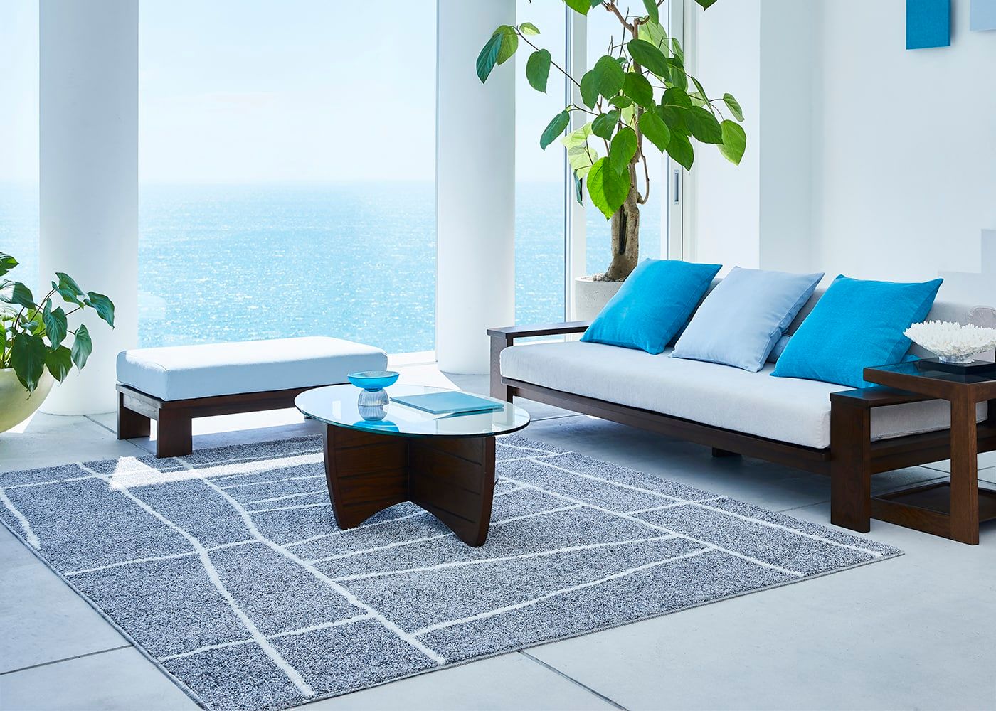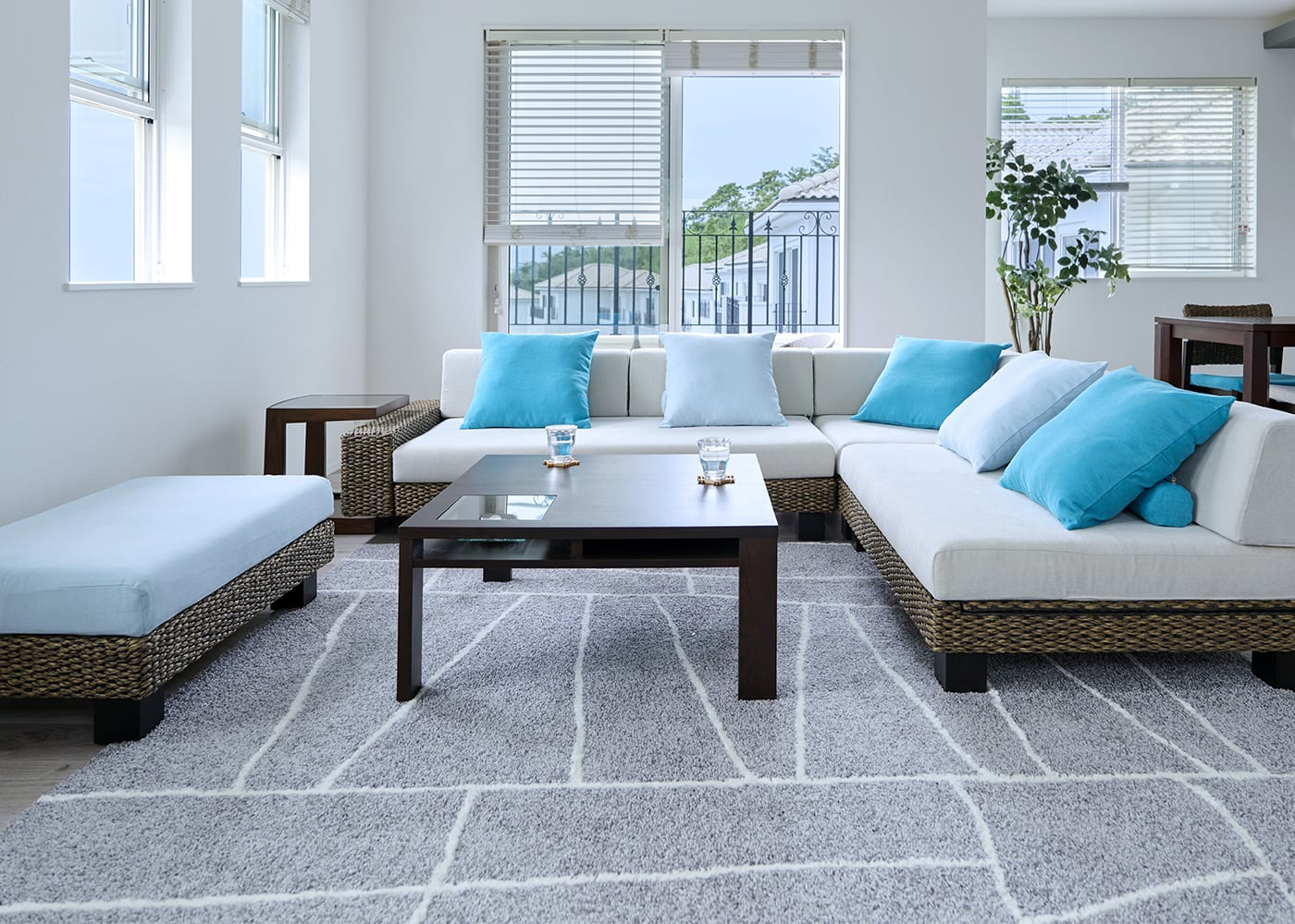 海の湘南をイメージした爽やかなLDK実例。海をイメージしたコーディネートや、砂浜のようなラグでリゾート気分が上がります。(写真はライトグレー1900×2400mm)