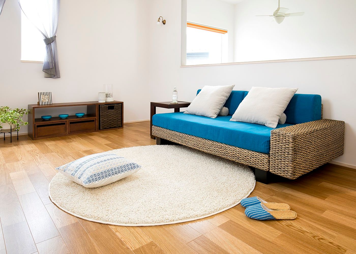 温もりあるヒヤシンスソファにブルーが映えるリビング実例。砂浜のような円形ラグでアクセントを付けて、優しい雰囲気の部屋を叶えました。(写真はアイボリー 直径1500mm)