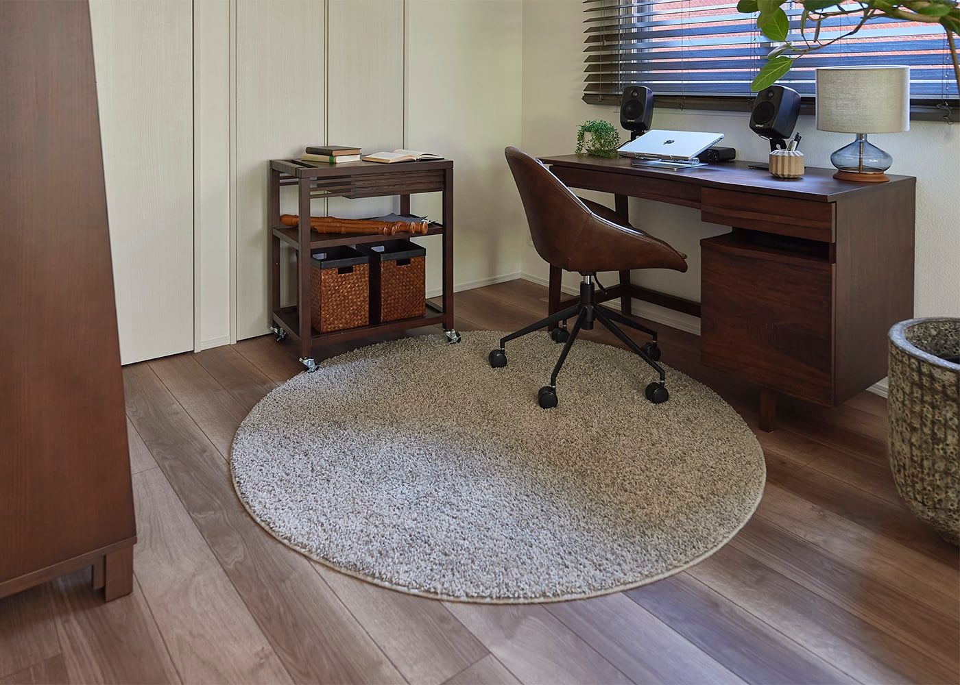 一人暮らし1LDKの書斎スペースに円形ラグを取り入れた実例。デスクとチェア周りに円形ラグを用いて、床を保護しながらおしゃれなアクセントも。(写真はグレー 直径1500mm)