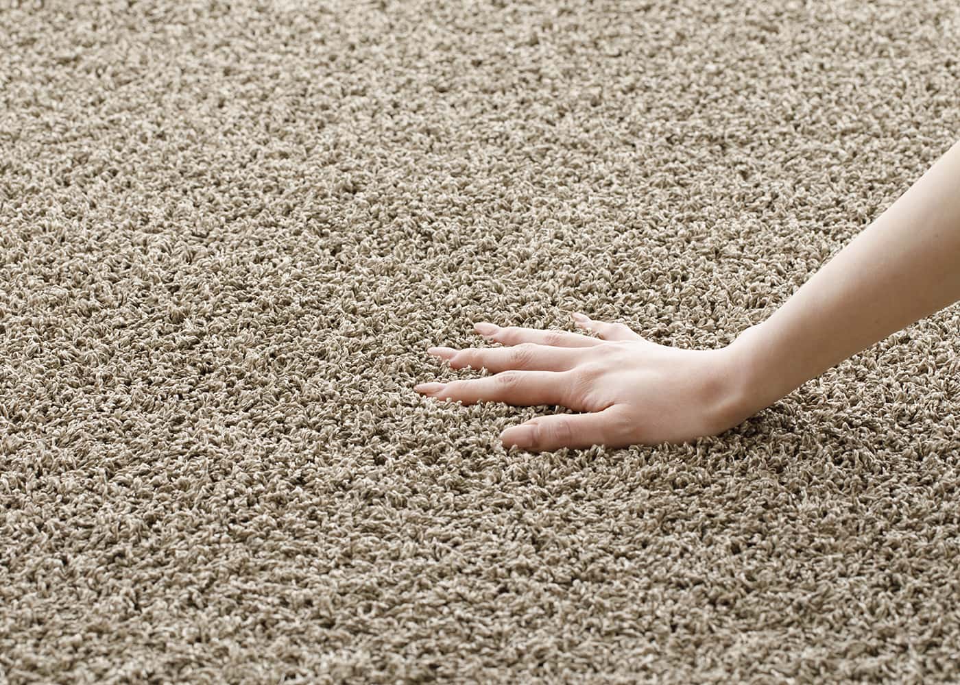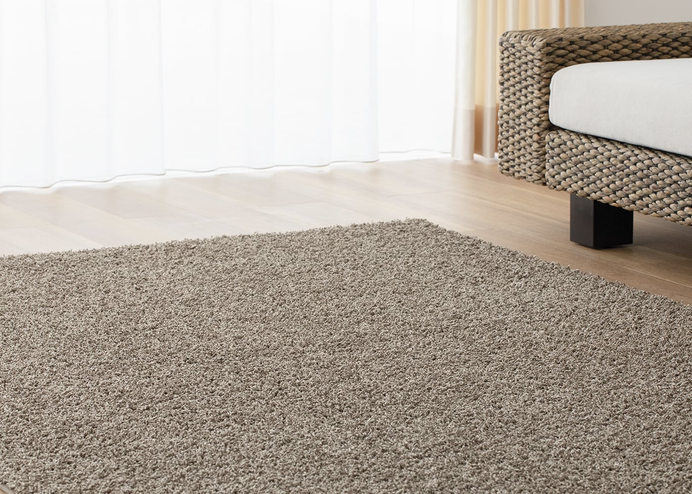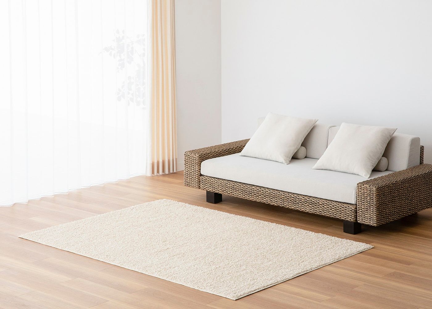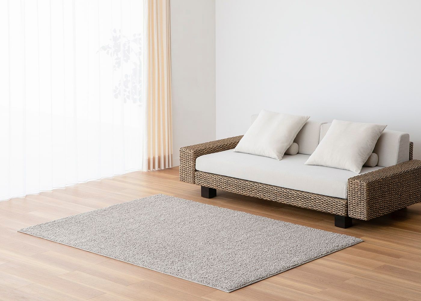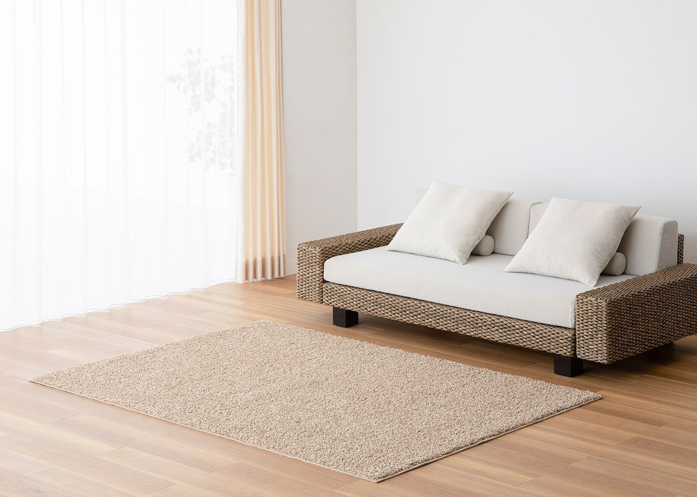 寝室にラグを敷くことで床周りにアクセントをプラスできたり、埃の吸着・声の吸音などの機能性を持たせることもできます。(写真はベージュ、1400×2000mm)