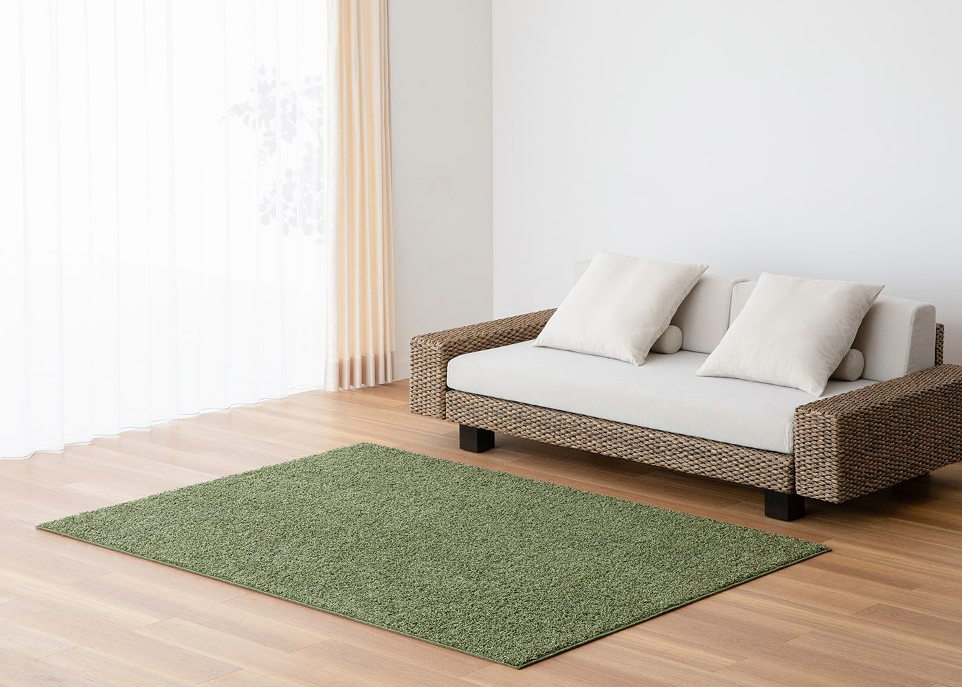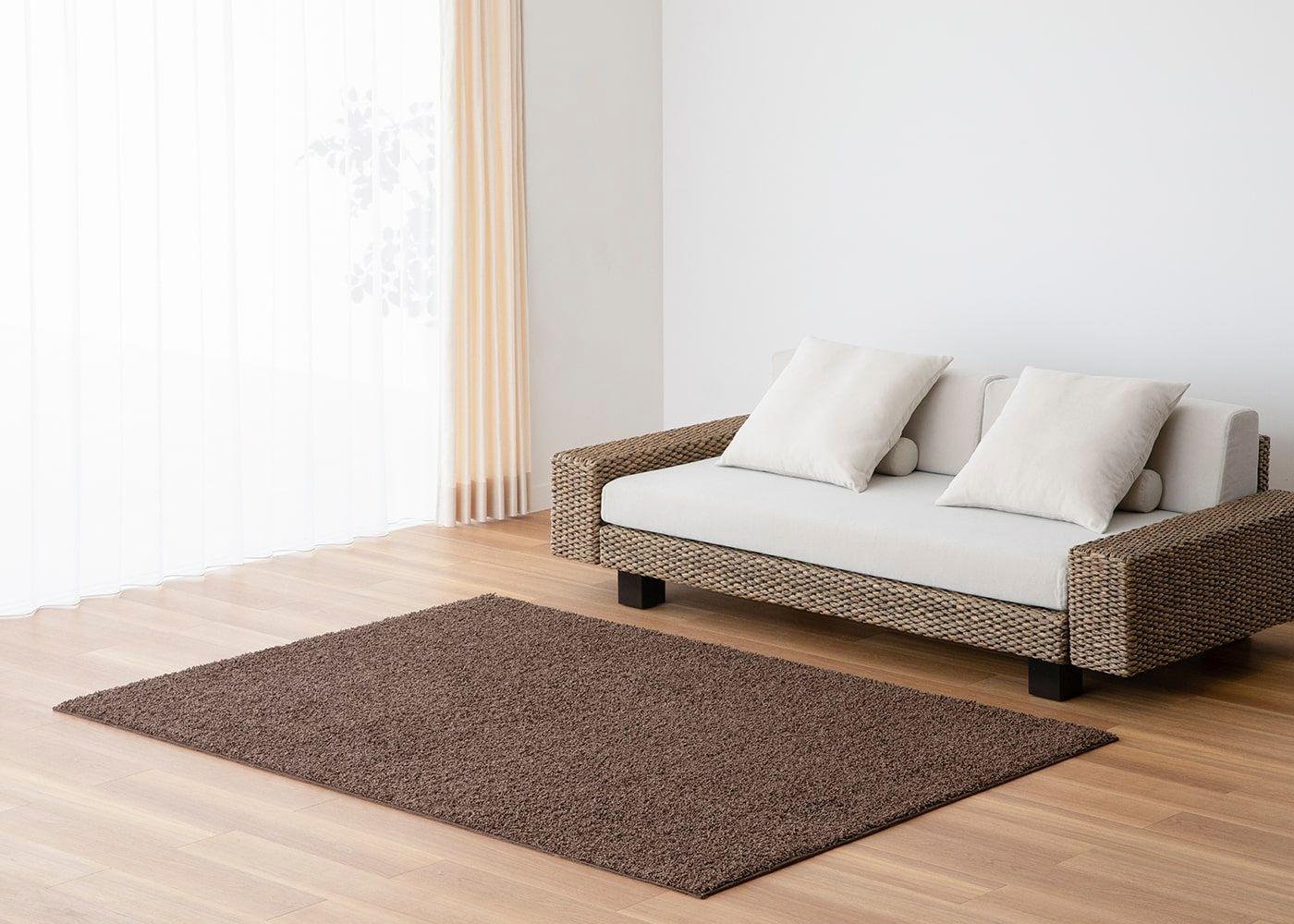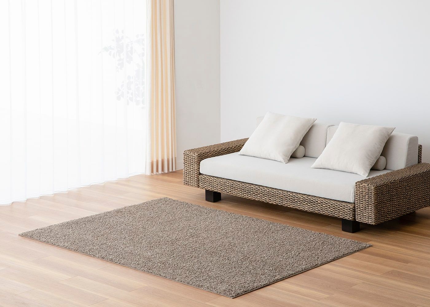 温もり感のあるヒヤシンス素材のチェアやスツールを引き立てるベージュ。ワンルームの空間にカフェスペースのようなレイアウトを組む際、その下側に敷き込むことで簡単にゾーニングできます。(写真はベージュ 1400×2000mm)