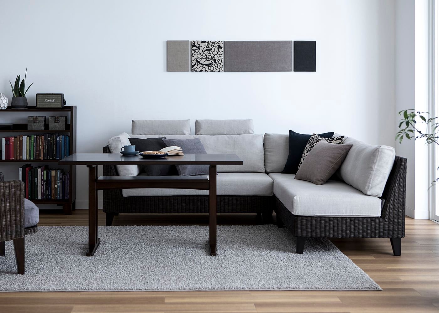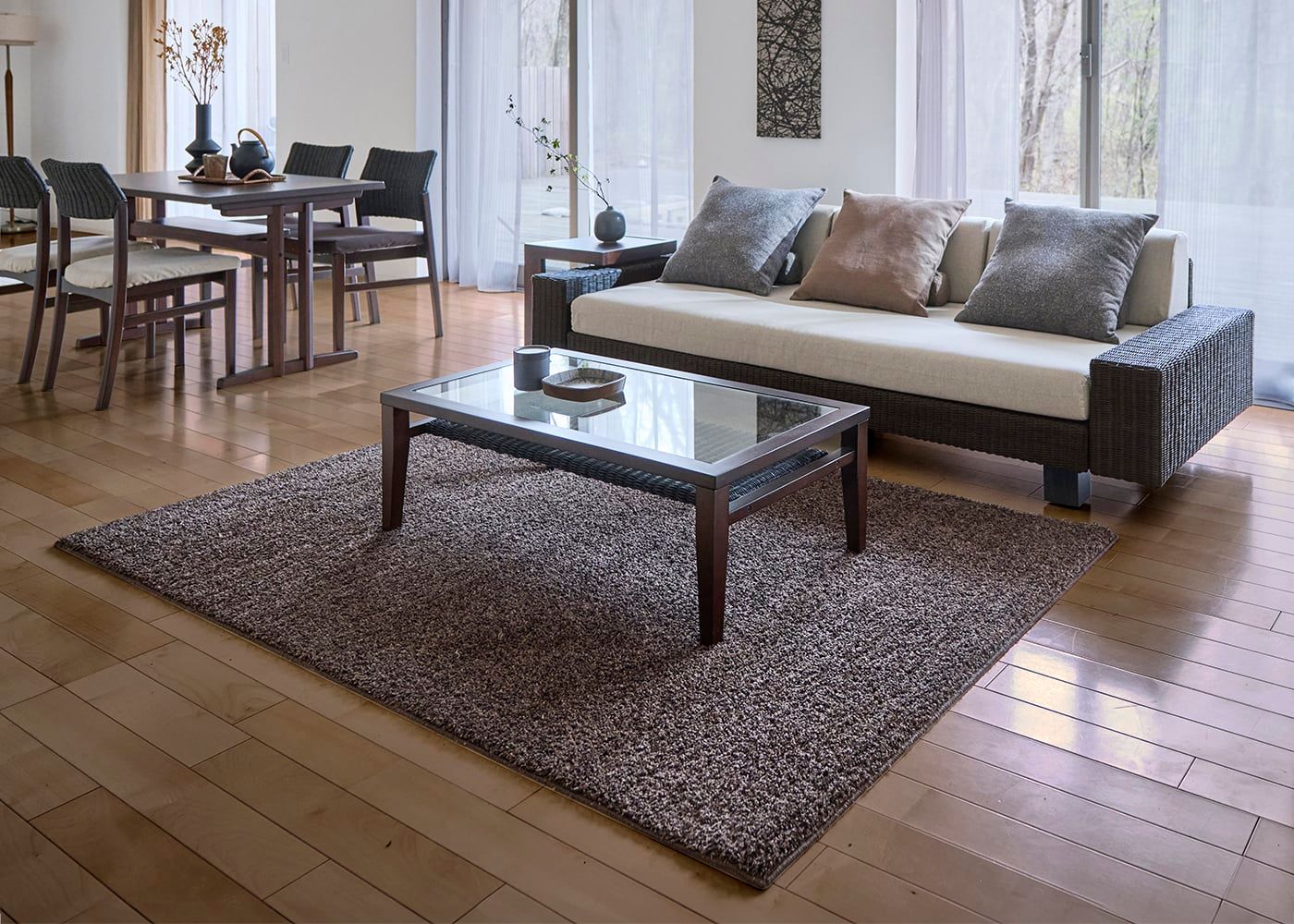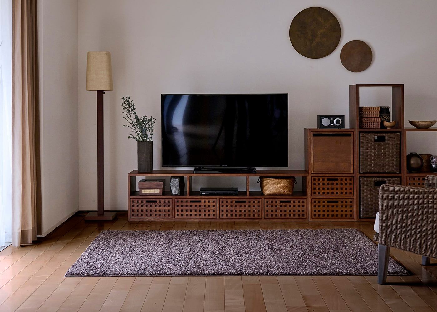 無垢材のユニット収納をランダムに組んだ、木の風合いを楽しめるセカンドリビング事例。おしゃなブラウンのインテリアやラグ、円形アートを楽しめるモダンアジアン空間です。(写真はブラウン 1400×2000mm)