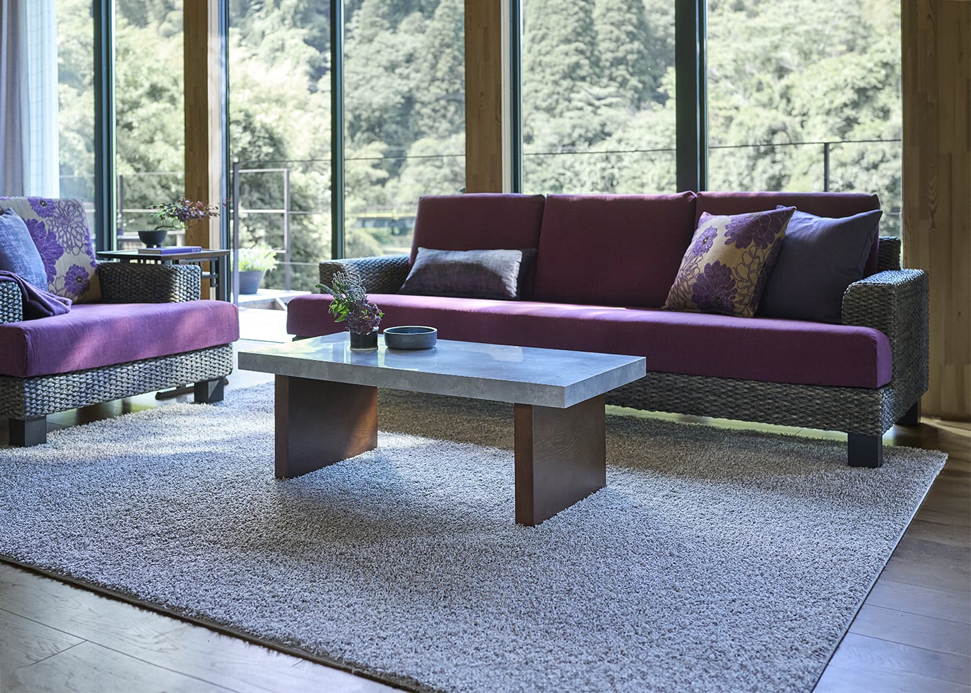 グレーの家具やラグは、紫のインテリアを引き立てる好相性な組み合わせです。落ち着いたトーンのグレーラグは、紫の鮮やかさを際立たせ、空間に洗練された雰囲気をもたらします。(写真はグレー 2000×2500mm)