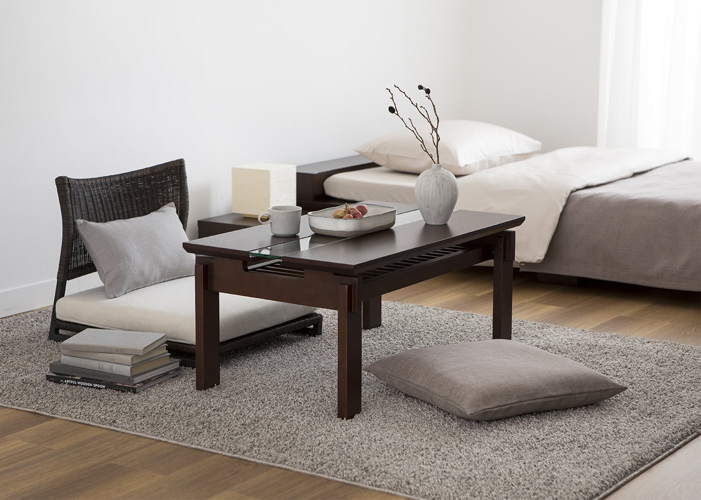 ワンルームに座卓を取り入れた和モダンな雰囲気ともマッチするグレー。光沢糸を撚り合わせたパイルの独特な表情や優しい感触を味わいながら、