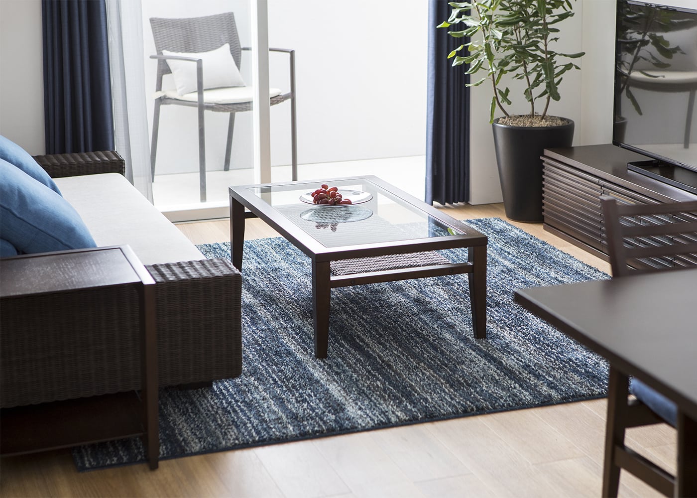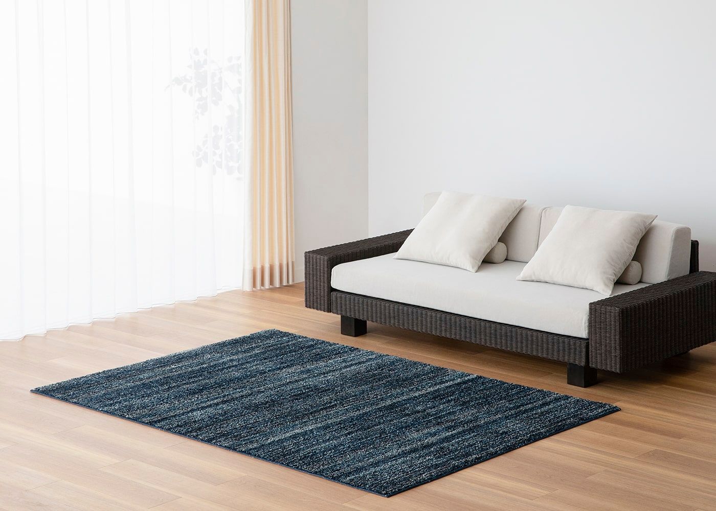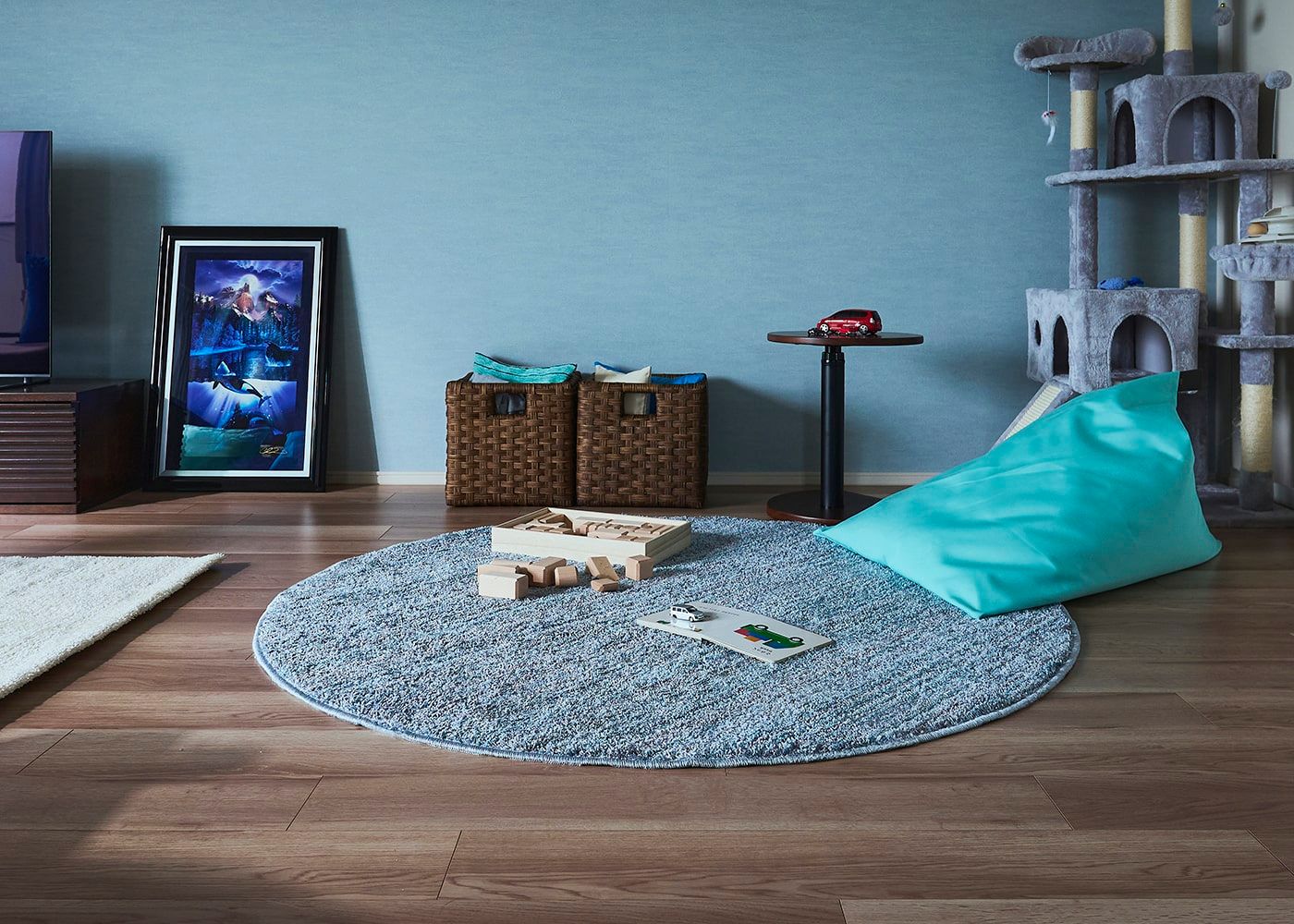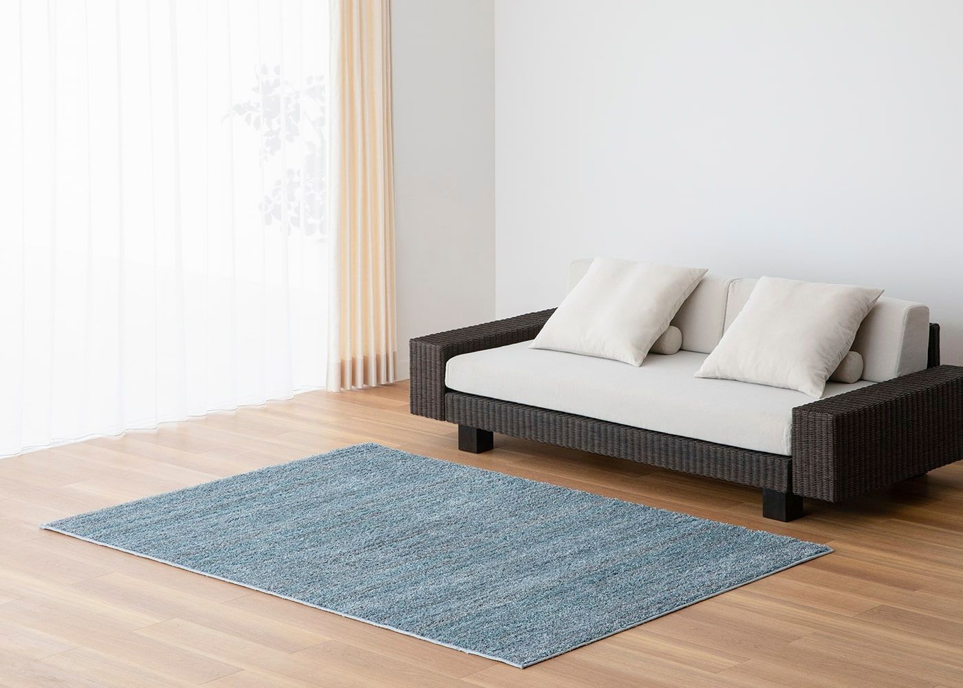 海を感じるようなブルーコーデの空間を、爽やかに見せるアクア。自宅を海辺のリゾートのように様変わりさせるラグを取り入れて、特別感のある時間を楽しんでください。(写真はアクア 直径1500mm)