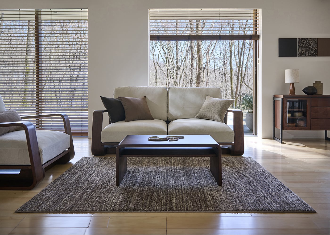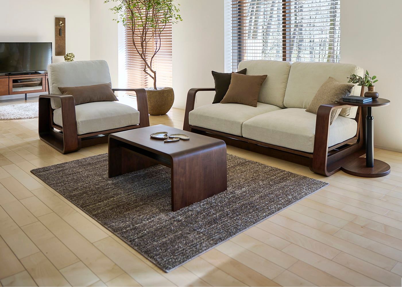 シンプルな部屋をおしゃれに見せるグレージュ。温もり感のある無垢材ソファと、ラグ フィーノの穏やかなカラーコーディネートを楽しめます。(写真はグレージュ 1400×2000mm)
