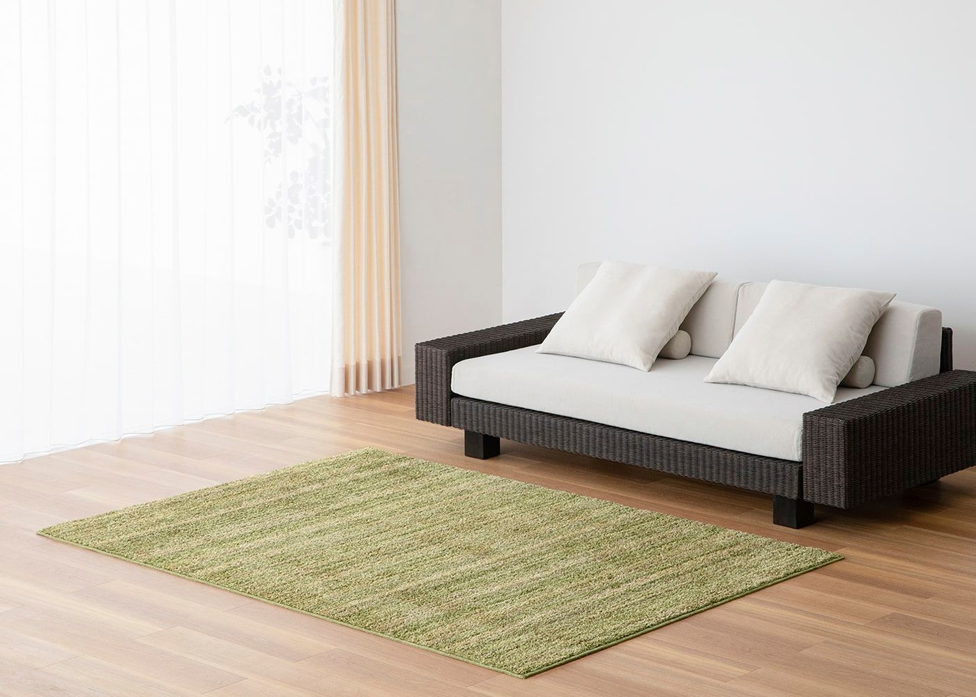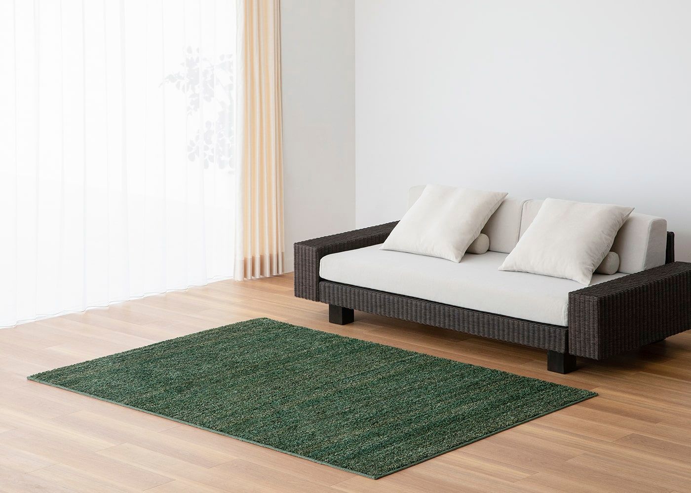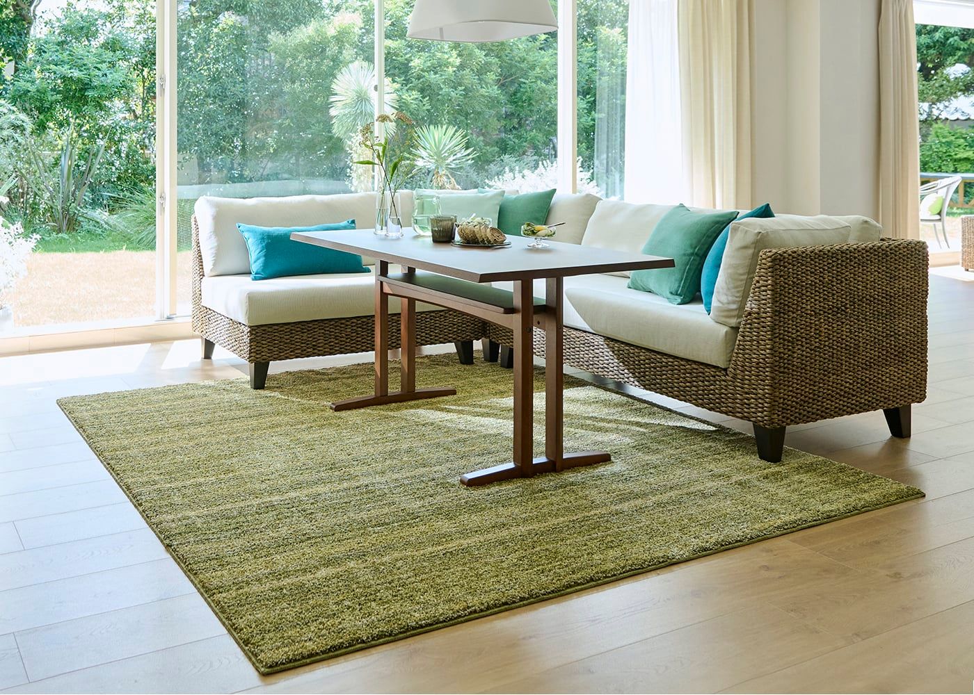 爽やかな緑に囲まれたロケーションに調和するグリーン。色とりどりの緑色で演出したリビングに、自然のゆらぎを感じるラグが加わって、非日的な部屋作りを楽しめます。(写真はヴィリジアン 1400×2000mm)