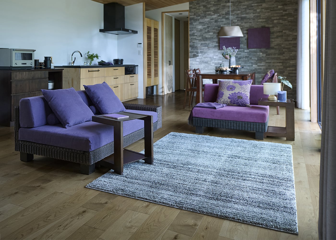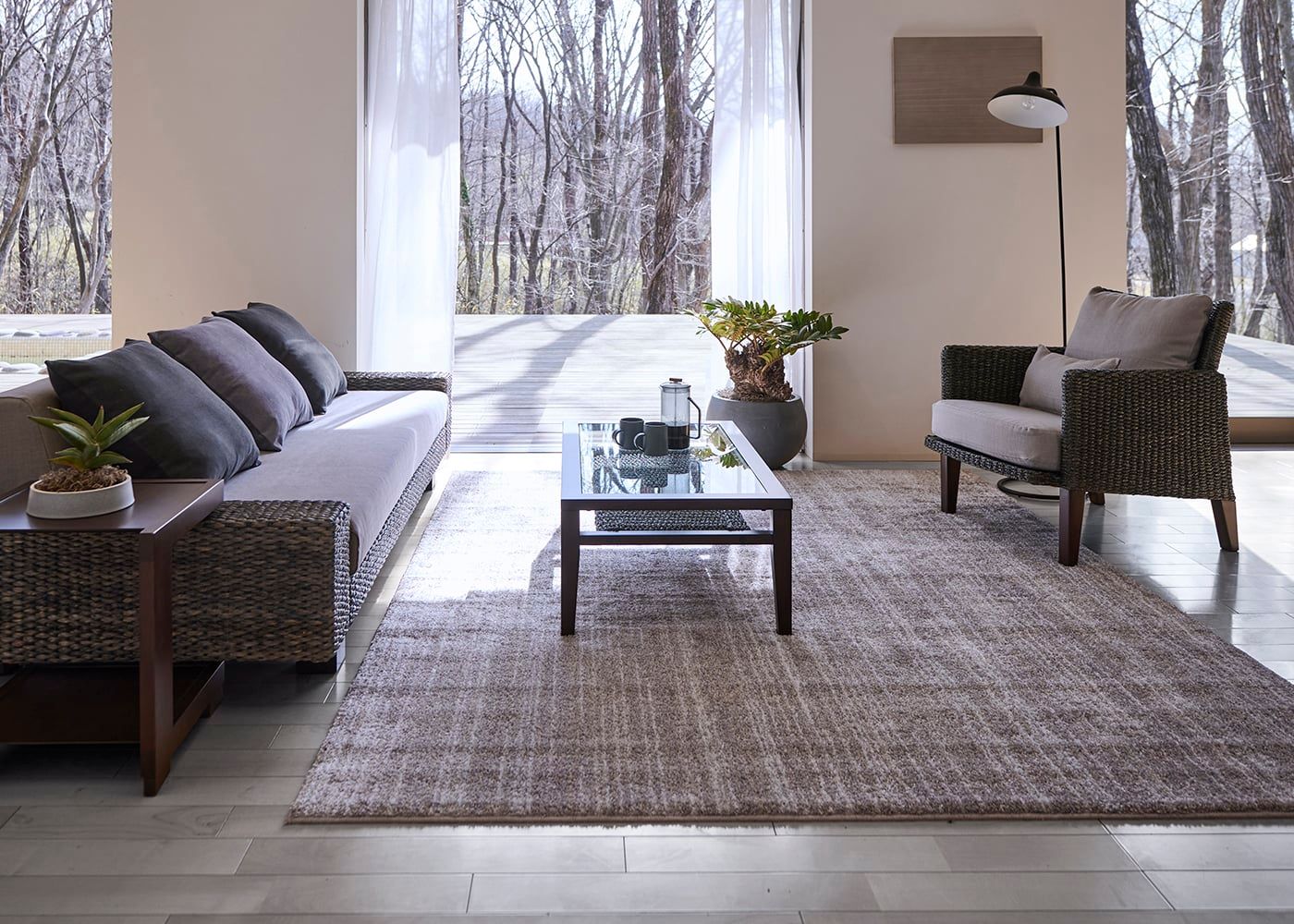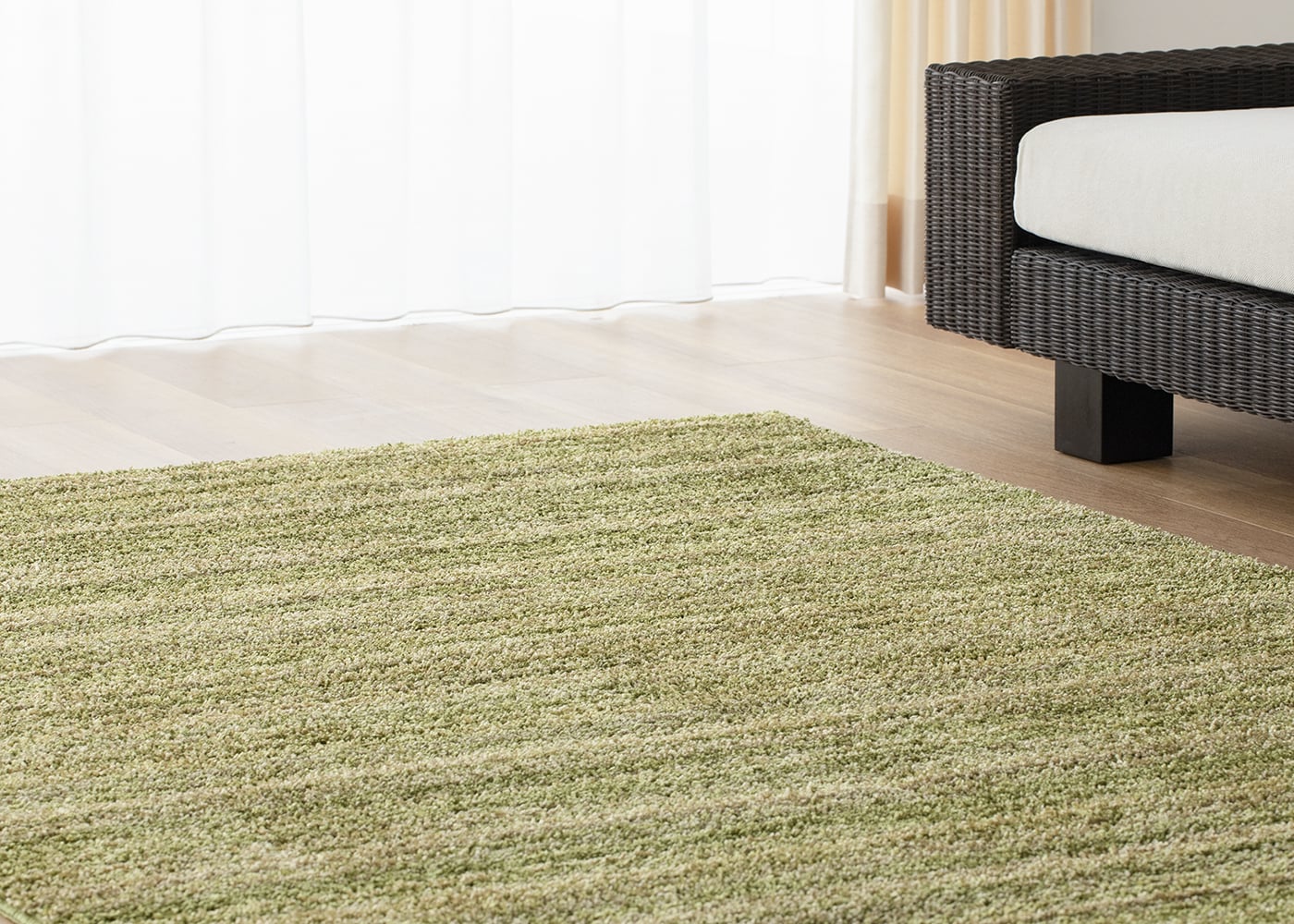 爽やかな緑に囲まれたロケーションに調和するグリーン。色とりどりの緑色で演出したリビングに、自然のゆらぎを感じるラグが加わって、非日的な部屋作りを楽しめます。(写真はヴィリジアン 1400×2000mm)