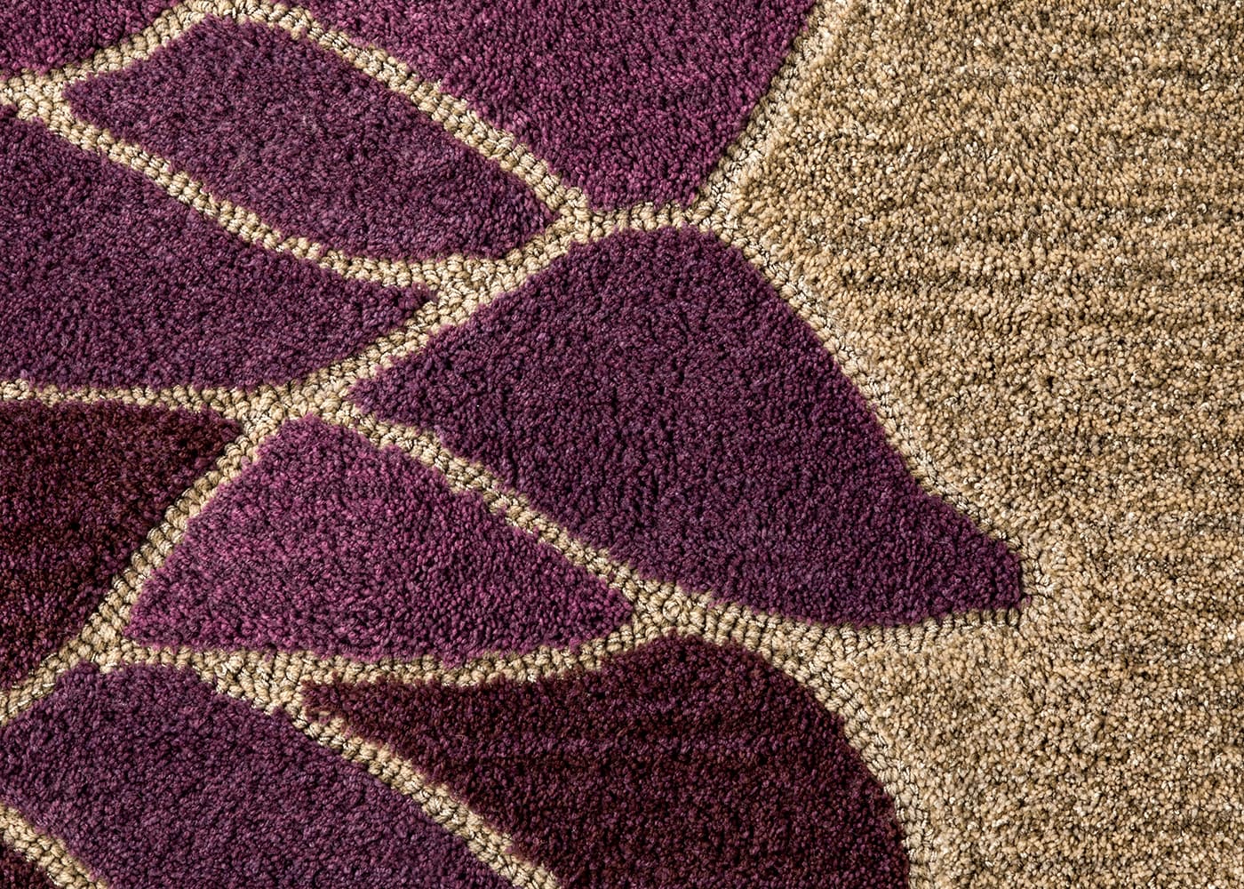 様々な紫で表現した花びらや毛足の長さの違いによって、浮かび上がる美しい蓮の花。光沢のあるナイロン糸をミックスしたベージュ色の背景がさらに高級感と華やかさを引き立たせます。