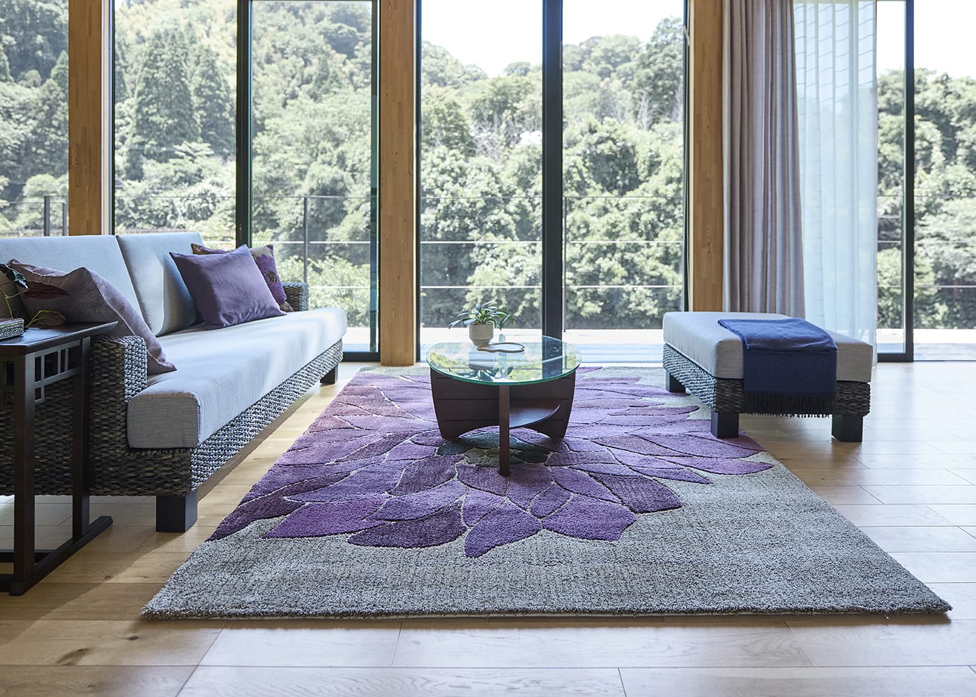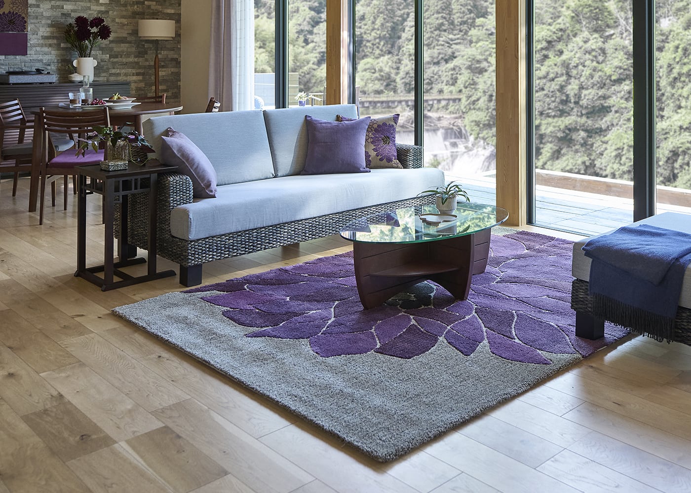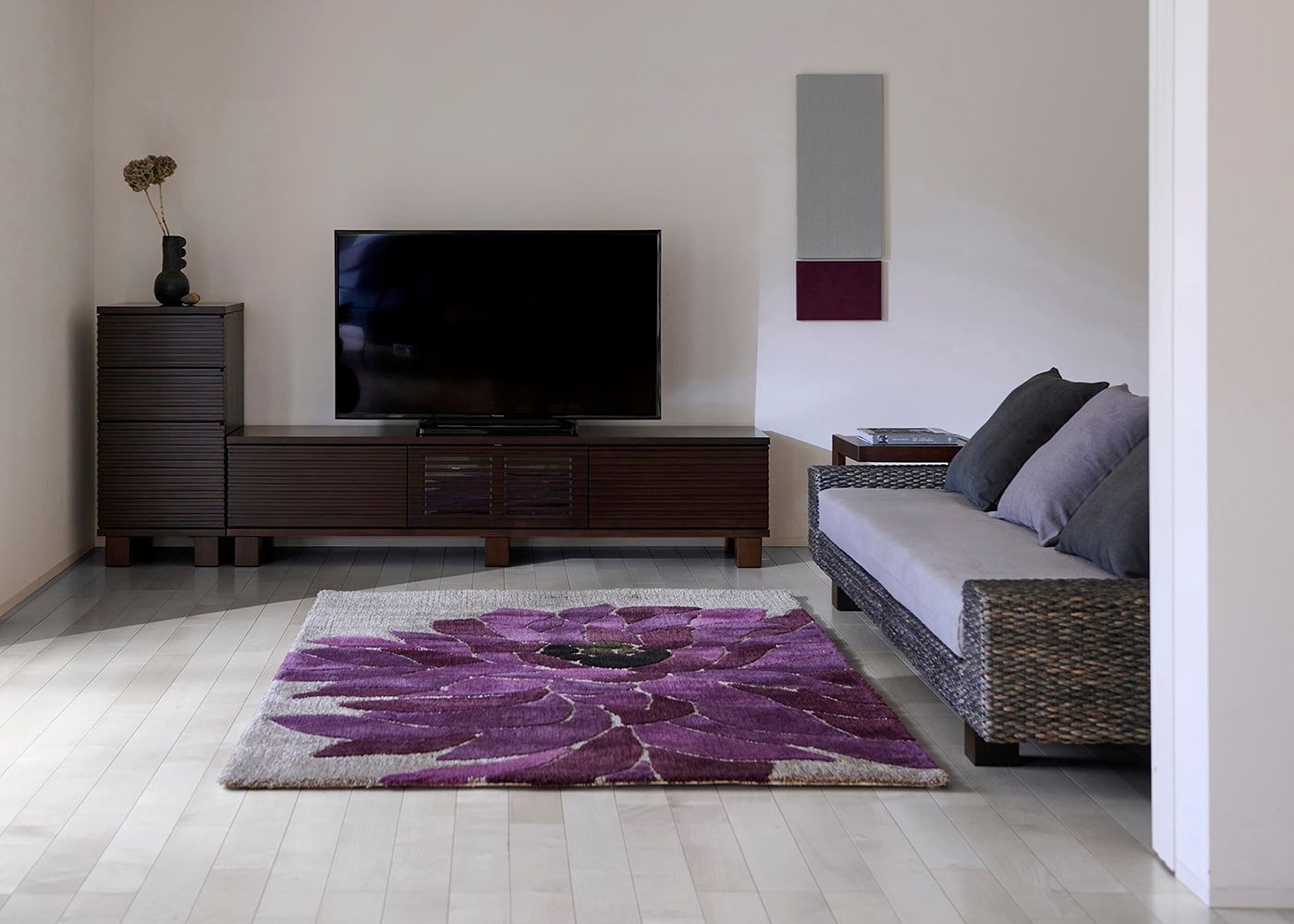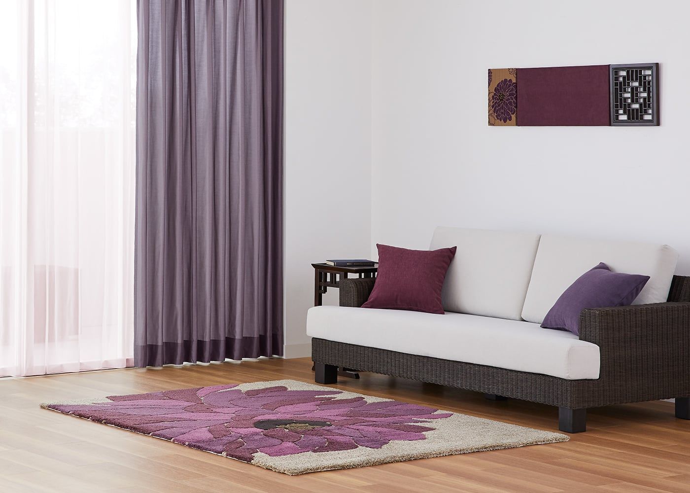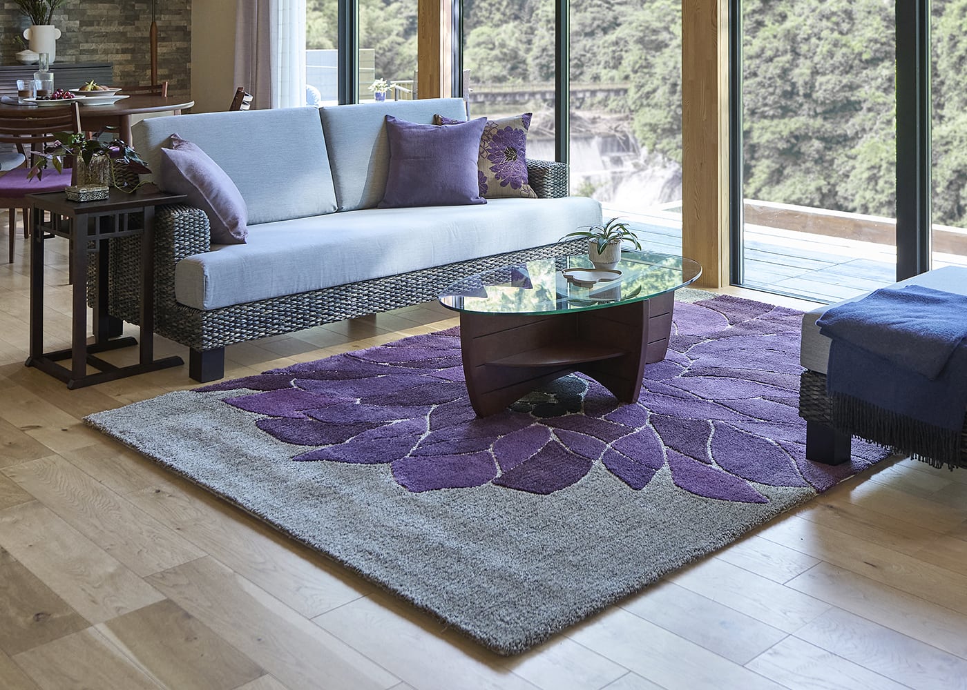 フラワーパープルスタイルを体現した、暮らしにアジアの風をもたらすa.flatオリジナルラグです。≫グレー×紫のアクセントが魅力のコーディネートは