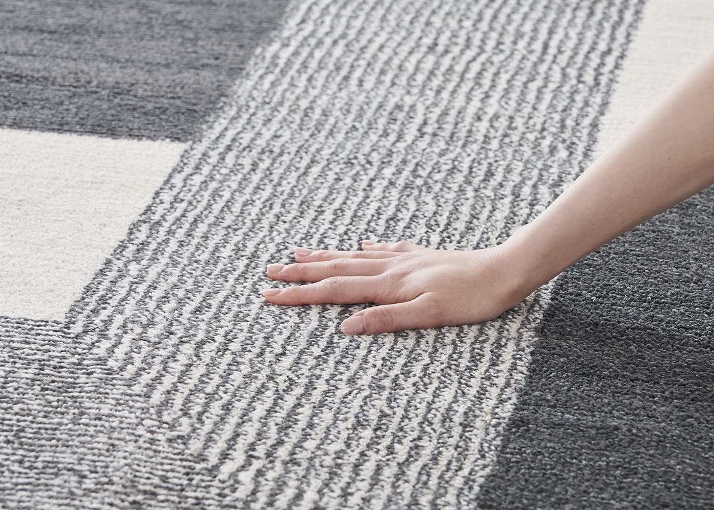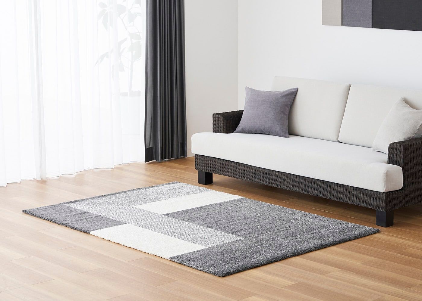 ⼿織りのような⾵合いと繊細な織り模様を機械織りで表現したウィルトン織りで作られたレクタ。グレーからホワイトの美しいグラデーションを用いた配色が特長です。耐熱ラテックスを使用しているため、床暖房やホットカーペットとして使用可能。さらに消防法施行令等で定められた防炎性能基準に基づいて作られた、燃えにくい防炎機能も備わっています。