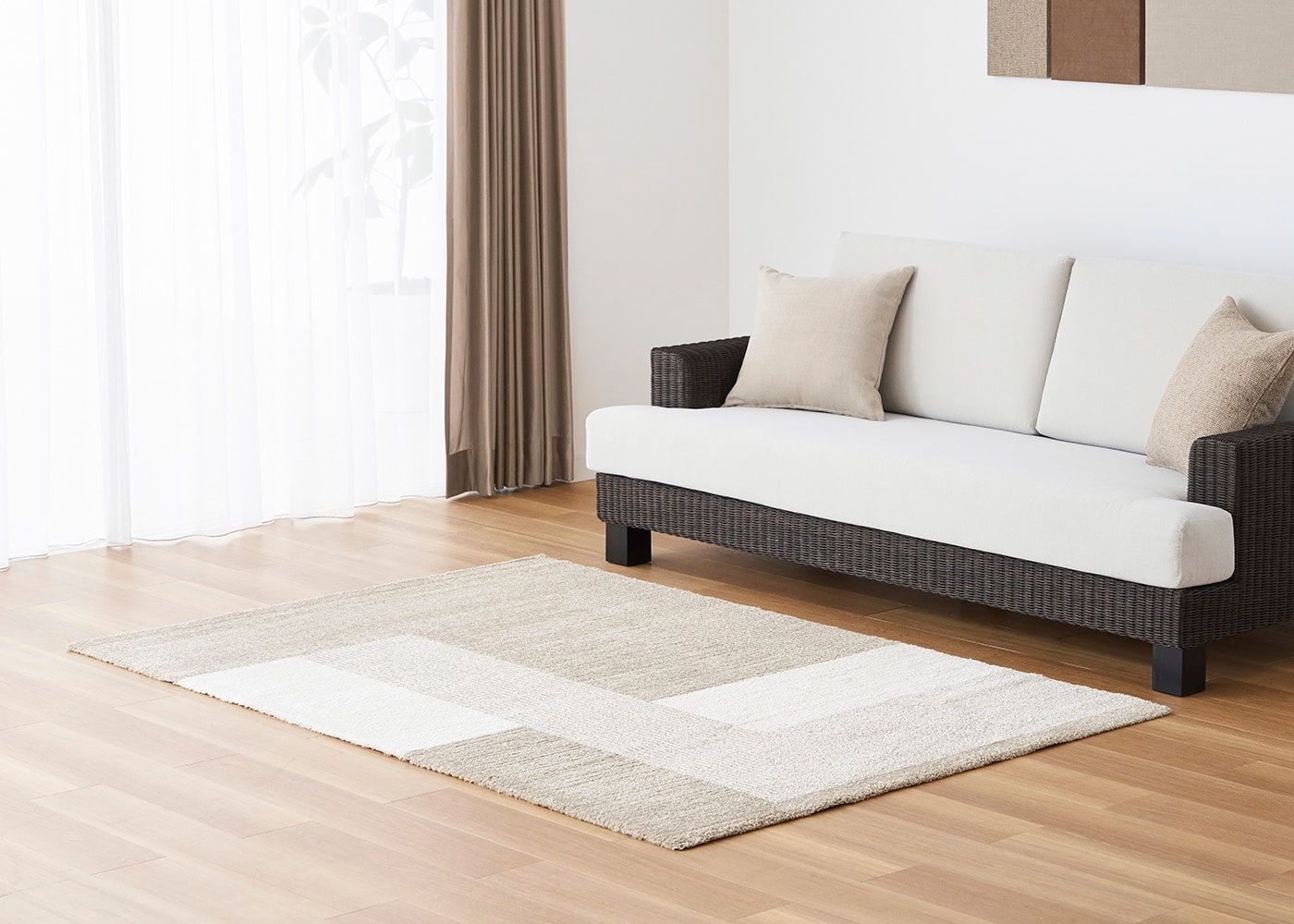 ベージュとホワイトのカラーリングは色の差が少ないため、柄ラグの中でも気軽に取り入れやすいのが魅力。壁面装飾カーテンにベージュ系をプラスした、明るいウッドブラウンコーディネートを楽しんでみては。(写真はベージュ 1330×1950mm。ソファは2.5人掛けの幅1850mm)