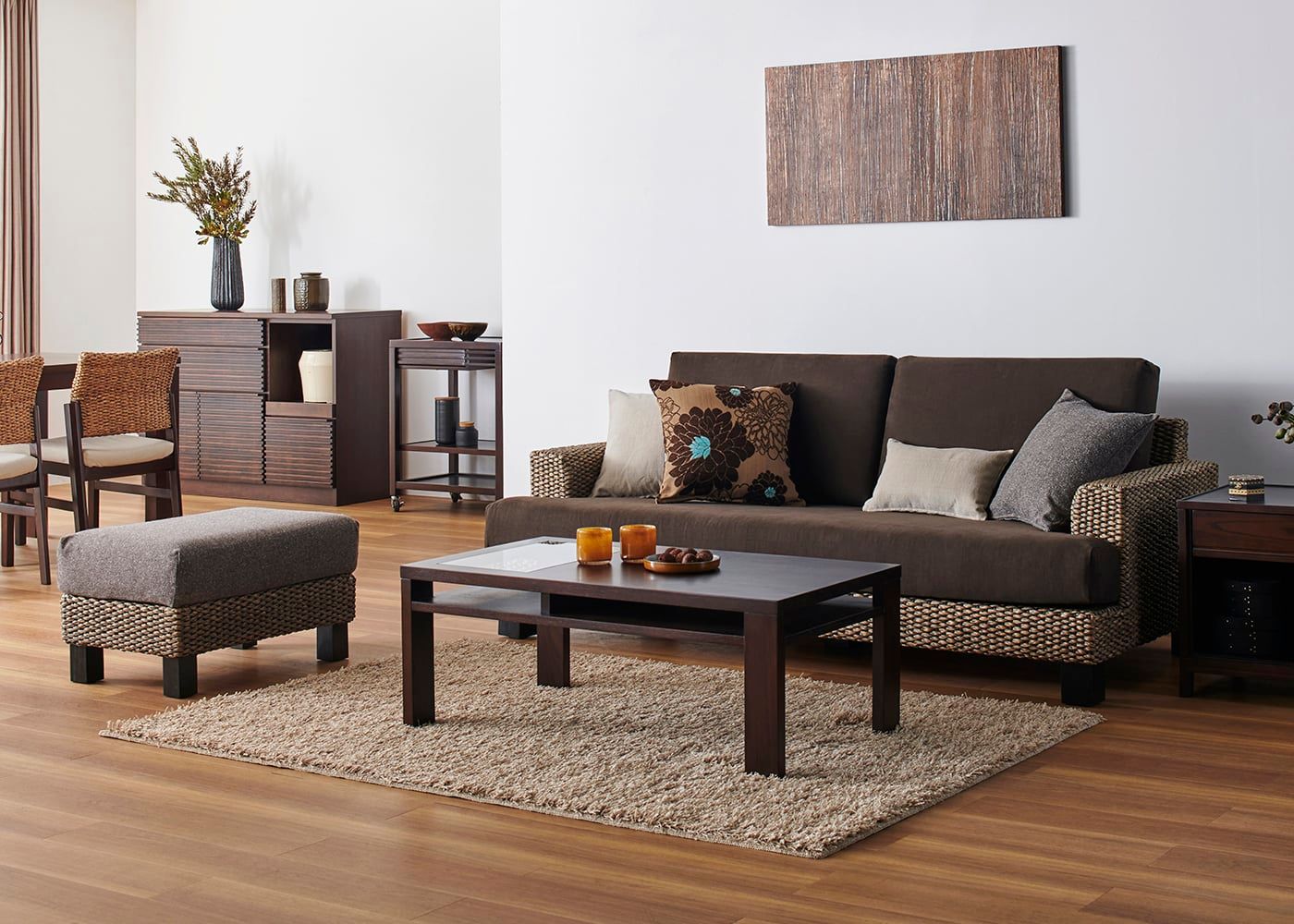 アジアンテイストの家具やインテリアで統一した空間に馴染むベージュ。リビングに毛足のあるシンプルなラグを敷き、素材感のある