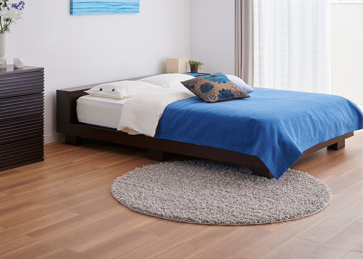 ラグ プラドv02 (円形)をベッド横に敷いたコーディネート例。爽やかなブルーで彩った空間に、砂浜を感じさせるような合わせ方です。寝室に円形ラグを敷くことで床周りにさりげなくアクセントをプラスできたり、埃の吸着・声の吸音などの機能性を持たせることもできます。(写真はグレー、直径1500mm)