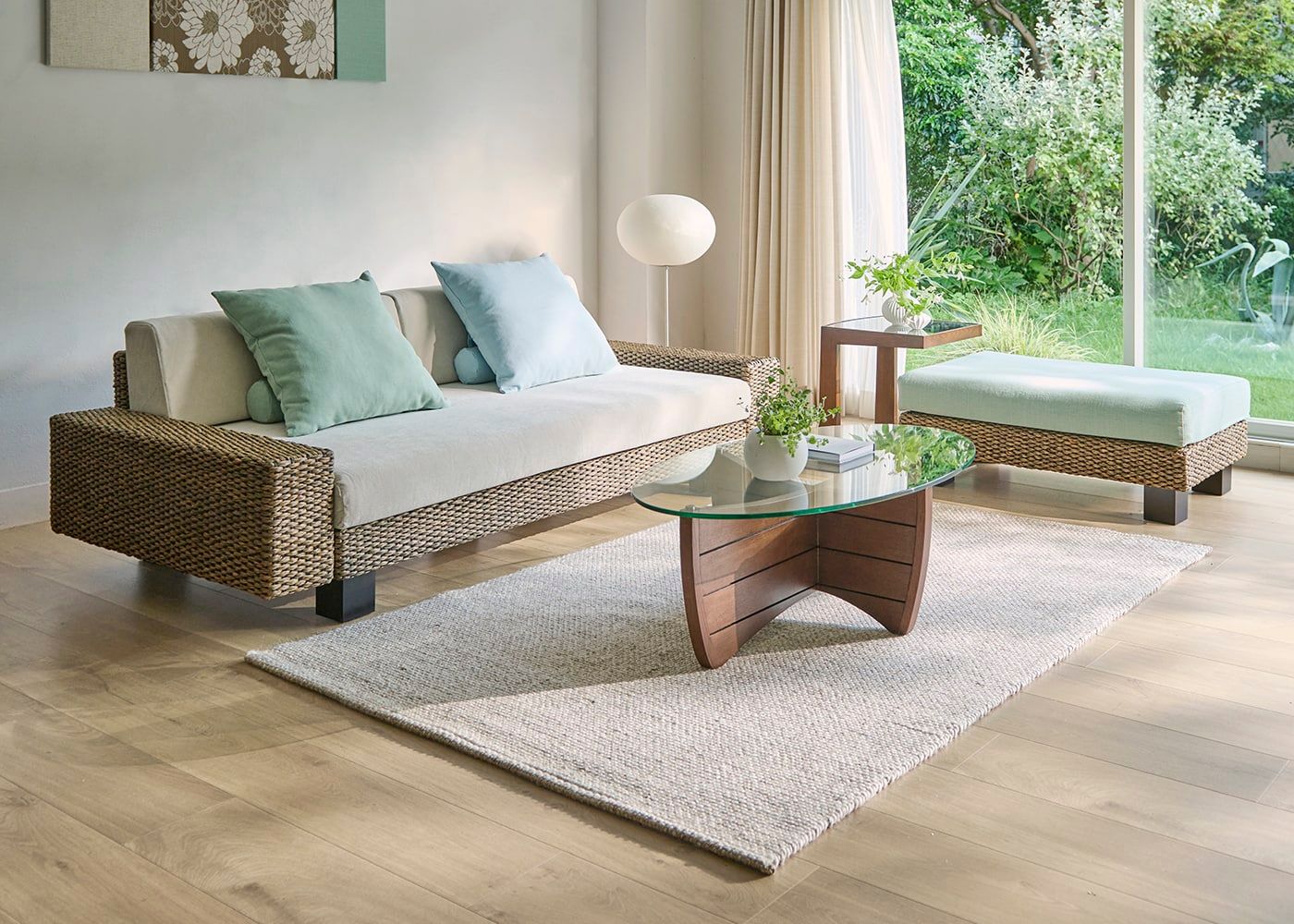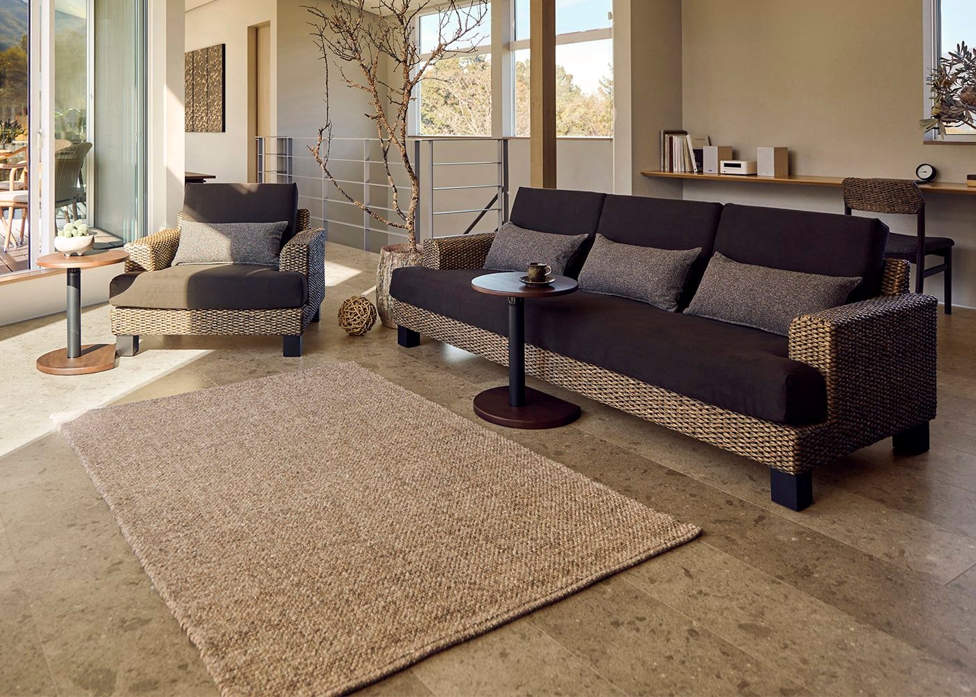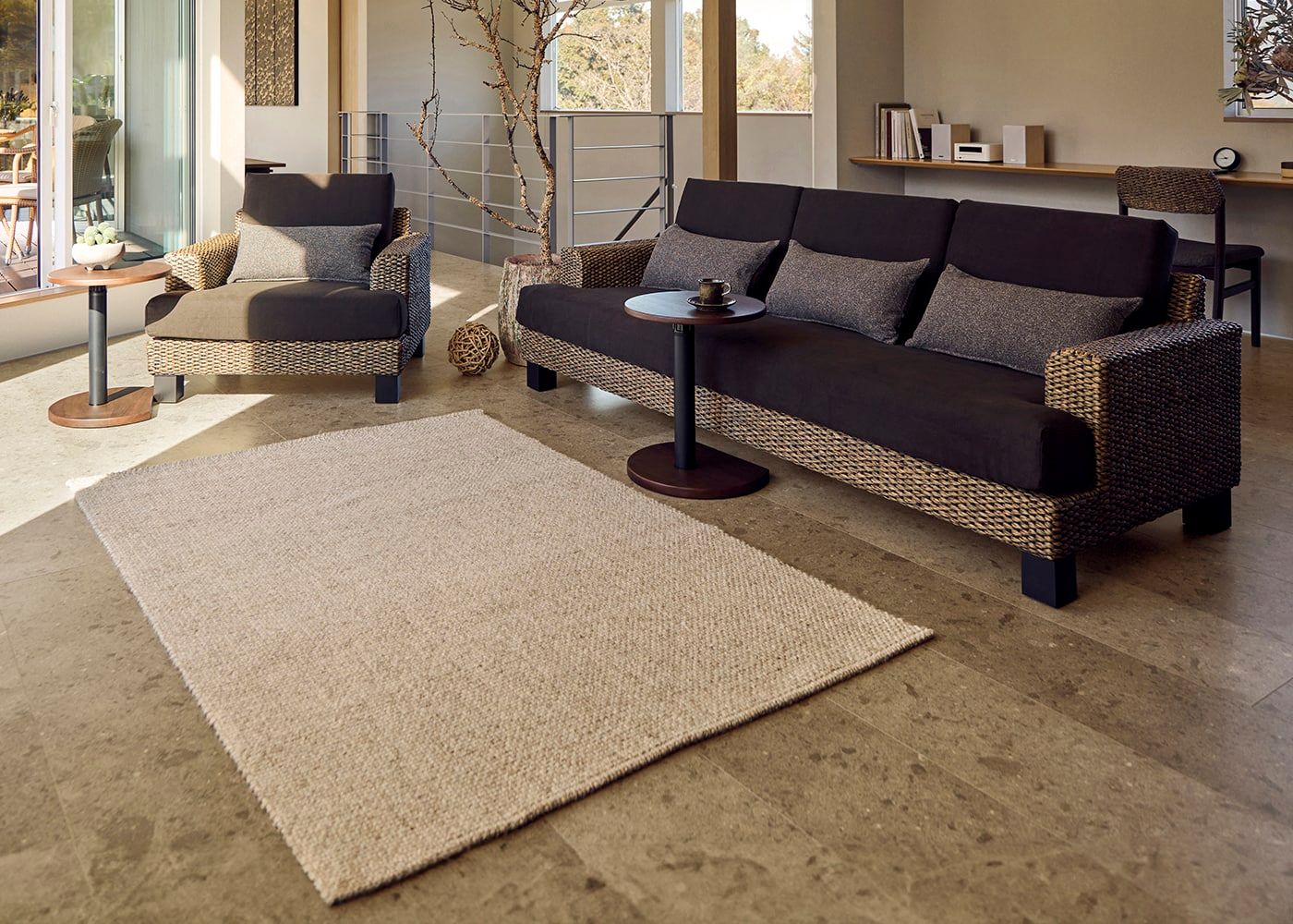 雄大な大地のぬくもりが満たす、安らぎのナチュラルリゾートなリビングコーディネート。大地のナチュラルな雰囲気と相性よいヒヤシンスソファに素材感のあるラグ パーヴを合わせると、広がる大地の中に身を置いたようなリビングに。(写真はベージュ 1300×1900mm) ≫コーディネート例の詳細はこちら