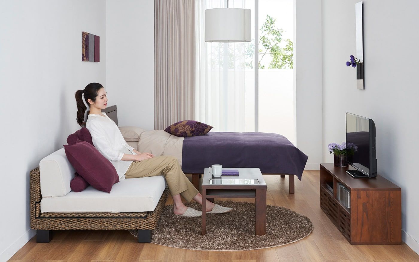 ソファやベッドにパープルのファブリックを取り入れた、神秘的で高級感のあるインテリアコーディネート。ラグとクッションの大きな花柄がポイントとなっております。