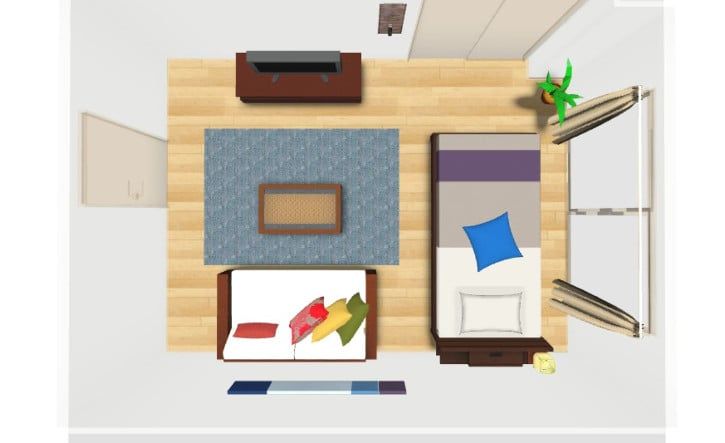 シンプルなウッドソファはシンプルなデザインなので、ソファカバーやクッションカバーで印象が変わります。上記のワンルームでは赤や緑、黄色のクッションを取り入れてブルーのラグを敷きました。海に架かる虹色のように、明るくさわやかなカラーコーディネートとなっています。